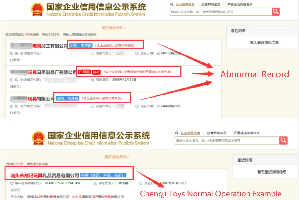 Ask the supplier to provide a watermarked business license and related operational files. Then, verify the company’s registration through China’s National Enterprise Credit Information Publicity System to confirm it’s not listed as “abnormal operation.”