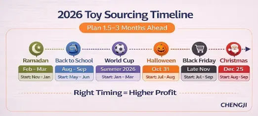 In a planned toy sourcing strategy, understanding seasonality + production & shipping cycles (1.5–3 months) is critical.