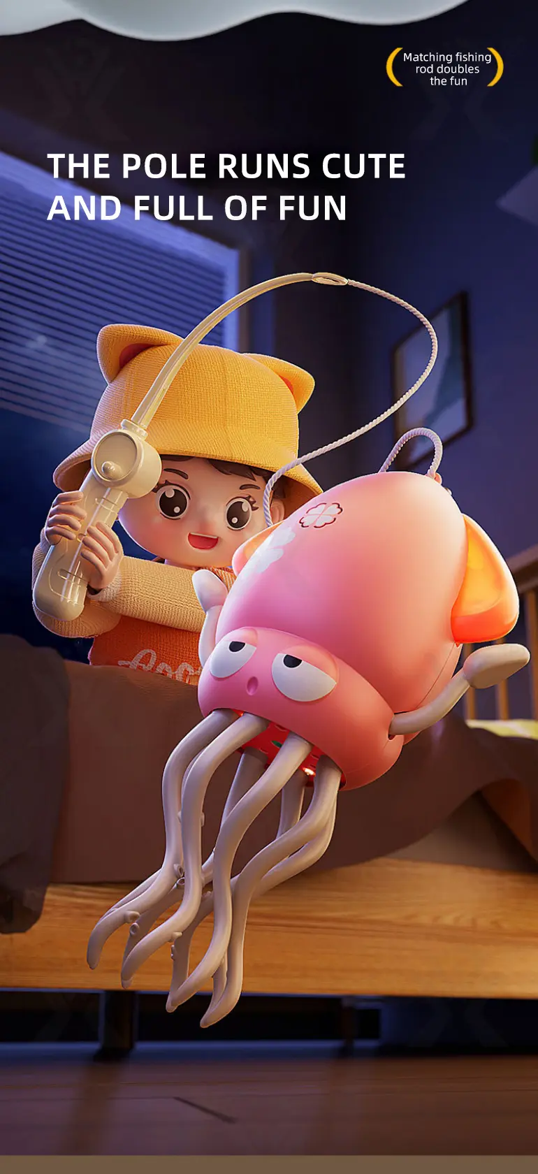 Wholesale magical dancing octopus toy. It can walk while lying down, has automatic obstacle avoidance, anti-fall design, includes a fishing rod, is double fun, cute & joyful, and develops hand-eye coordination.