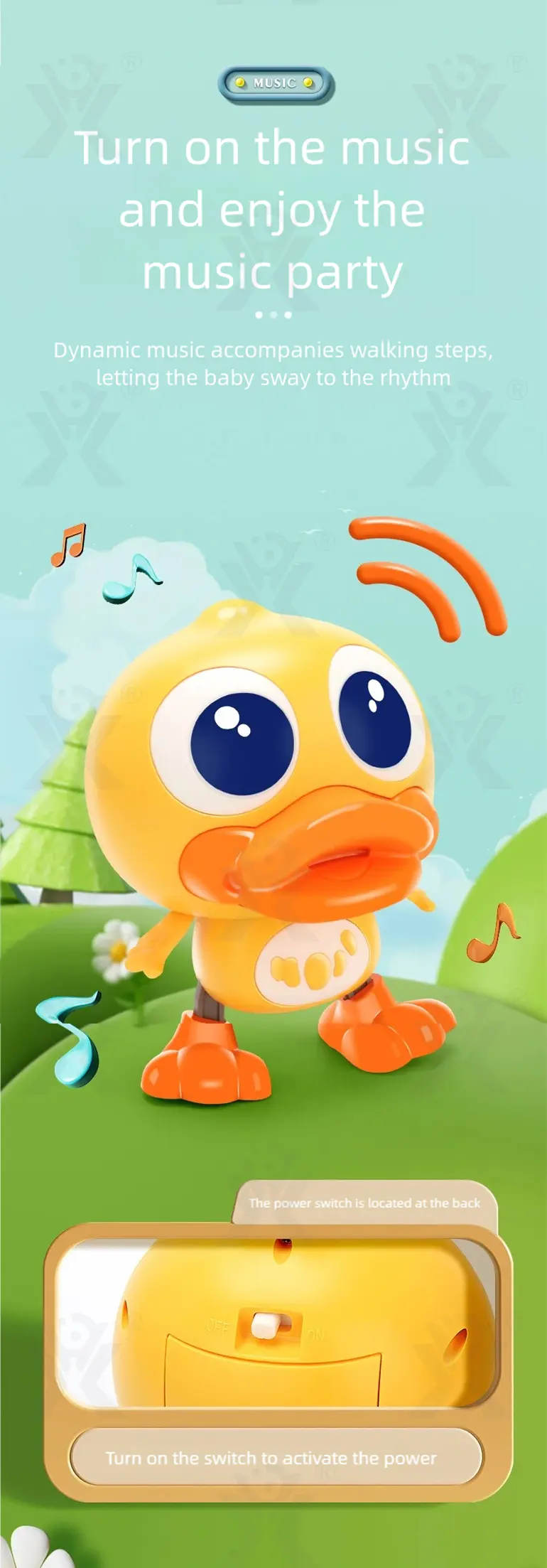 Bright lights and cheerful music accompany the duck’s movements, engaging sight and sound while helping develop rhythm and visual tracking. -