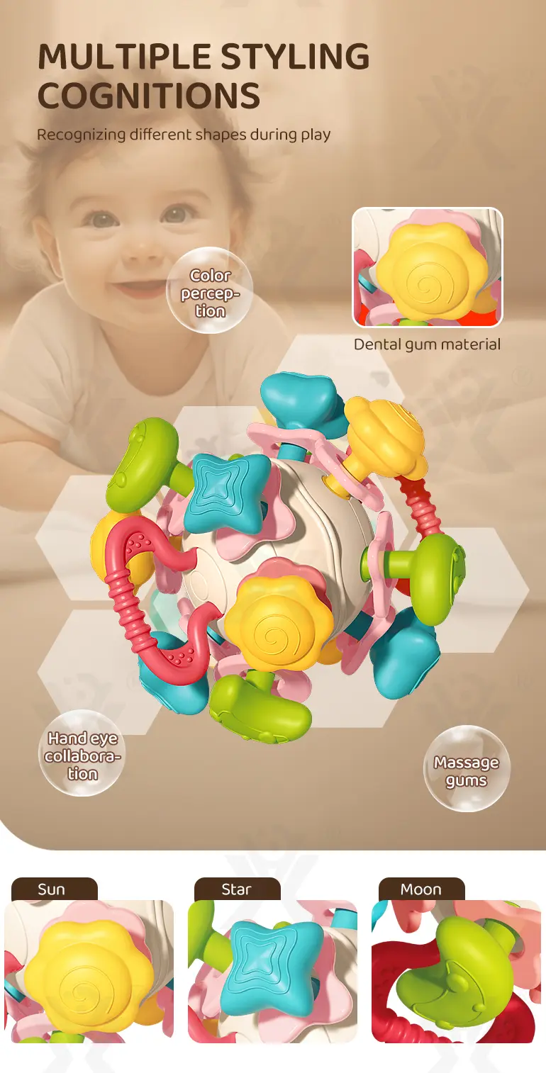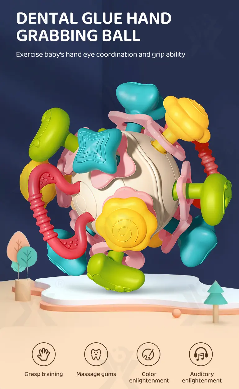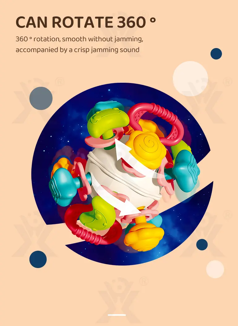 Wholesale teether ball toy, multiple grip points, 360° smooth rotation, crisp sound, massages gums, color & shape recognition, develops hand-eye coordination.
