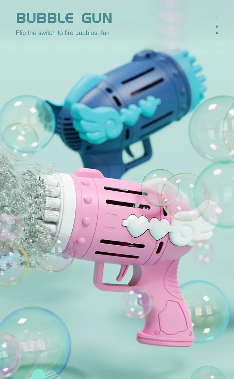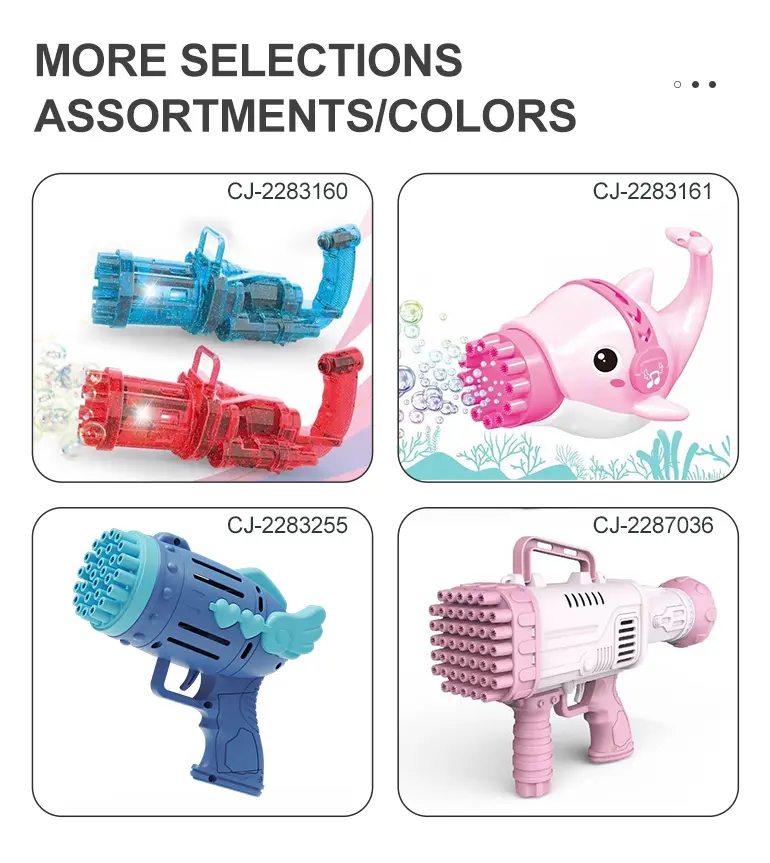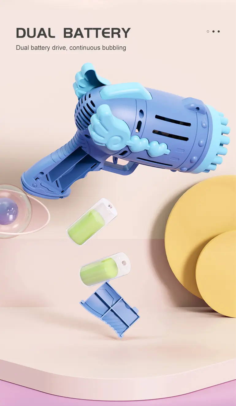 Wholesale Bubble Blower Gun. This Bubble gun has a dual battery drive, continuous rotating bubbles, a smooth burr-free handle, safe ABS material, and easy-dip operation.