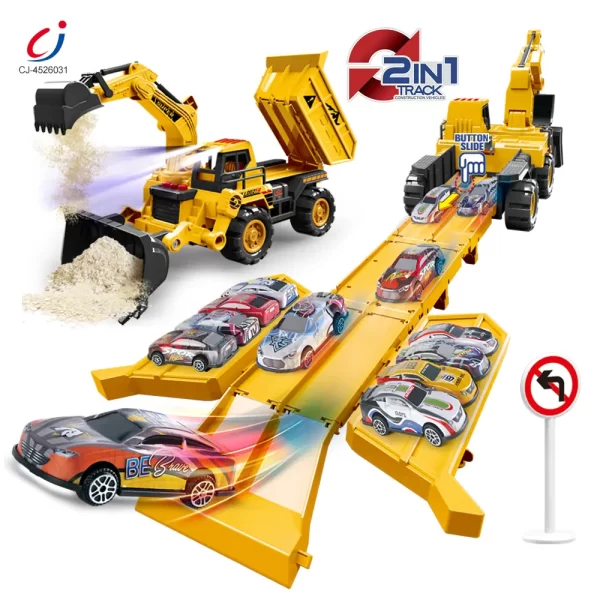 Wholesale construction vehicle toy sets. Our all-in-one construction truck toy set features a versatile 78cm long construction truck that transforms into a fully functional racetrack, with spring-loaded shooters and storage compartment. Offers immersive 4-in-1 play: dozing, transporting, track launching and creative building. Products meet global safety certifications and are suitable for toy distributors, online retailers and gift suppliers. Contact us for a quote.