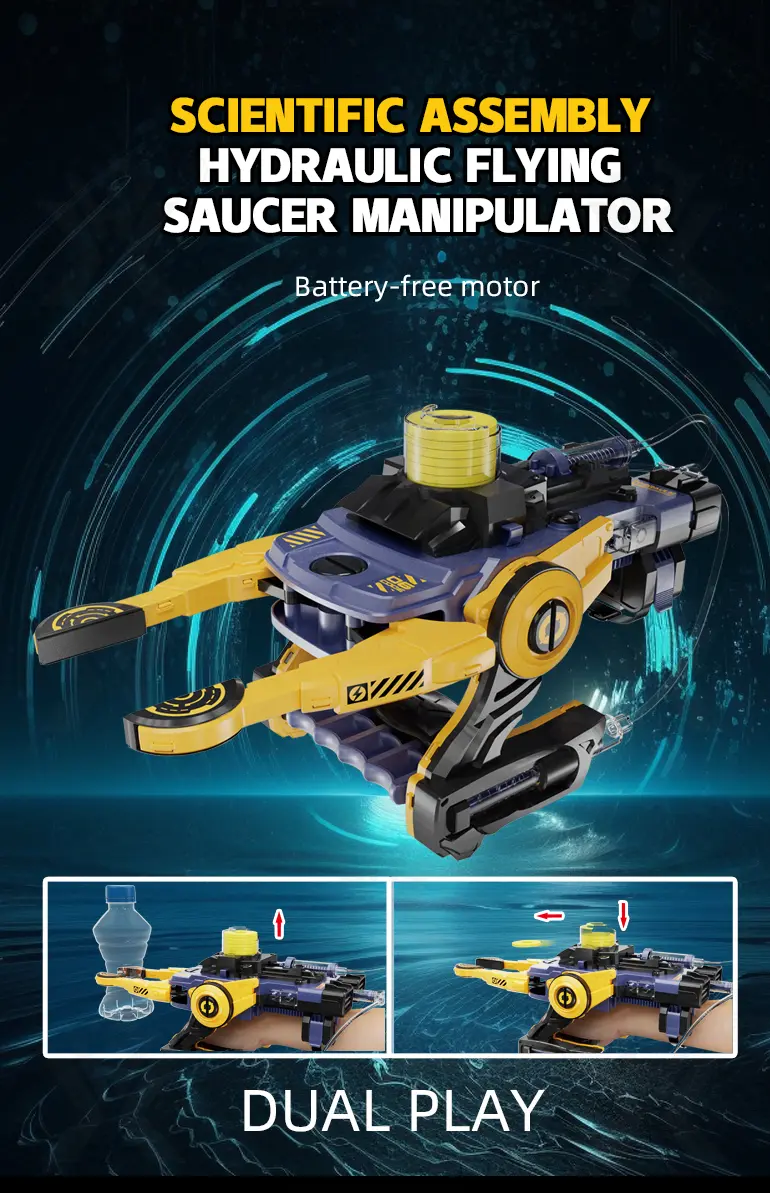 This hydraulic manipulator toy uses fluid pressure to move robotic arms, teaching hydraulic principles without batteries or electricity.