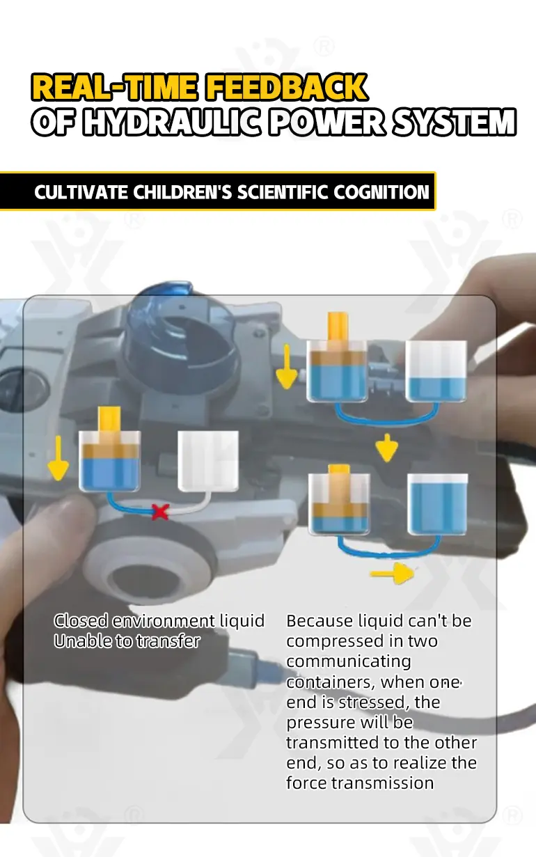 This toy demonstrates liquid pressure transmission in closed systems, offering immediate visual and tactile learning.