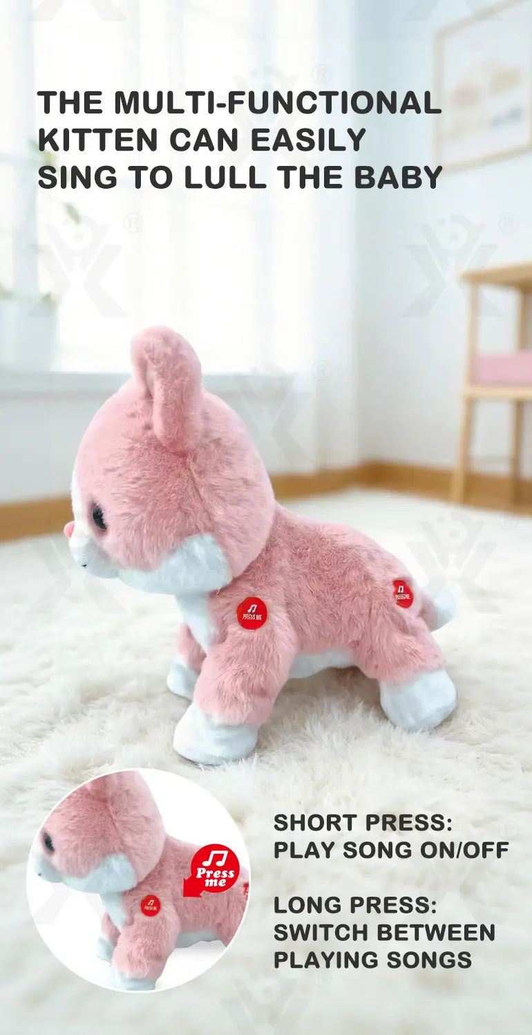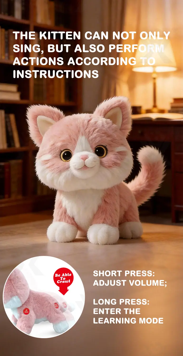 Beyond playing music, this plush cat performs physical actions based on voice commands. It can crawl forward, turn its head, or move in response to specific instructions. These movements make the toy more engaging than static plush toys, encouraging children to interact actively rather than passively watching. The combination of sound and motion creates a richer play experience. -