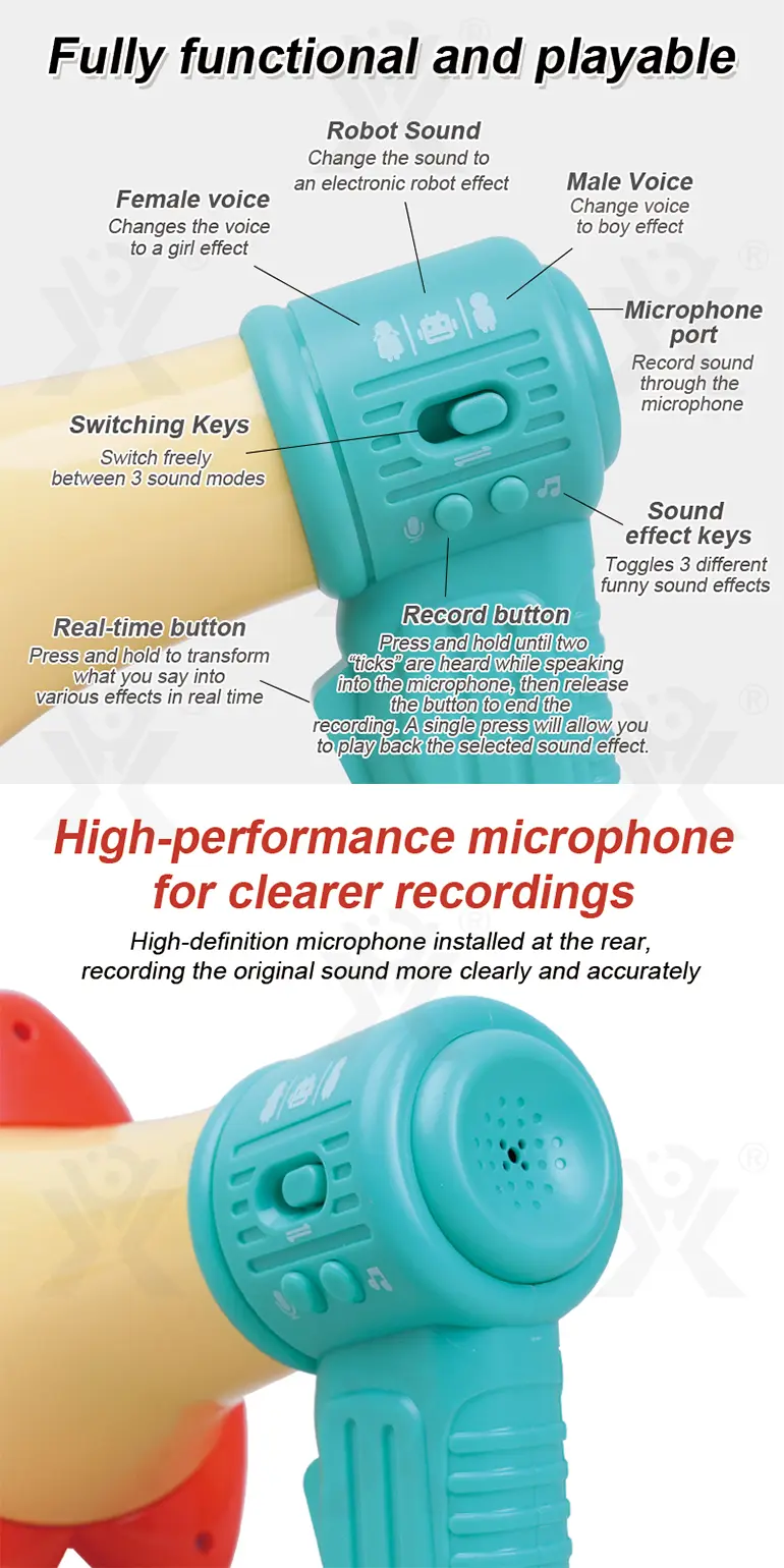 - Interrupteur d'effet sonore à une touche pour une utilisation facile : Des boutons dédiés aux modes et aux effets sonores permettent de basculer facilement entre 3 modes vocaux et 3 sons amusants. La présentation intuitive permet aux enfants de l'utiliser de manière autonome.