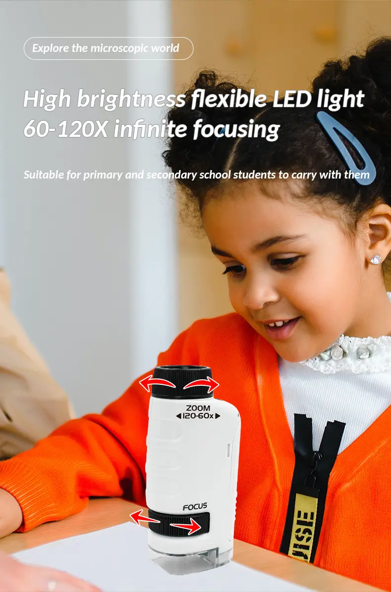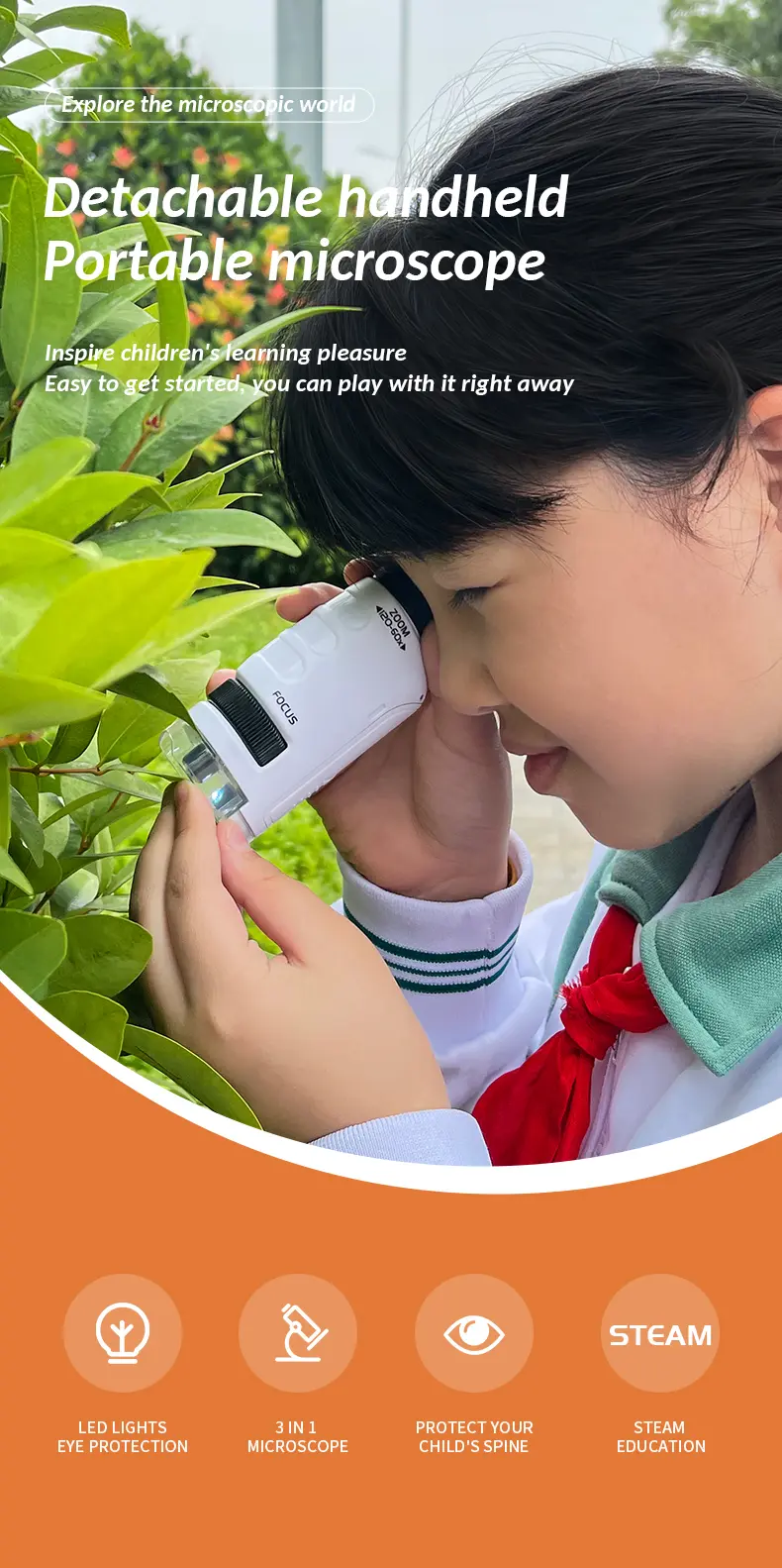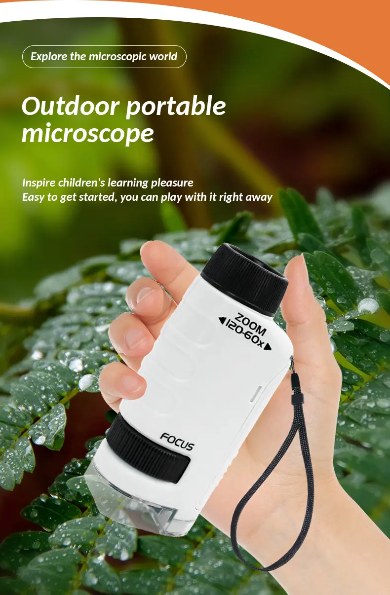 Wholesale 3-in-1 portable microscop toy, anti-lost strap, 60-120X continuous zoom, high-brightness flexible eye-protection LED, no specimen prep needed, smartphone compatible, inspires STEAM exploration.