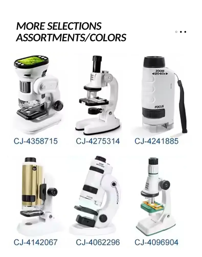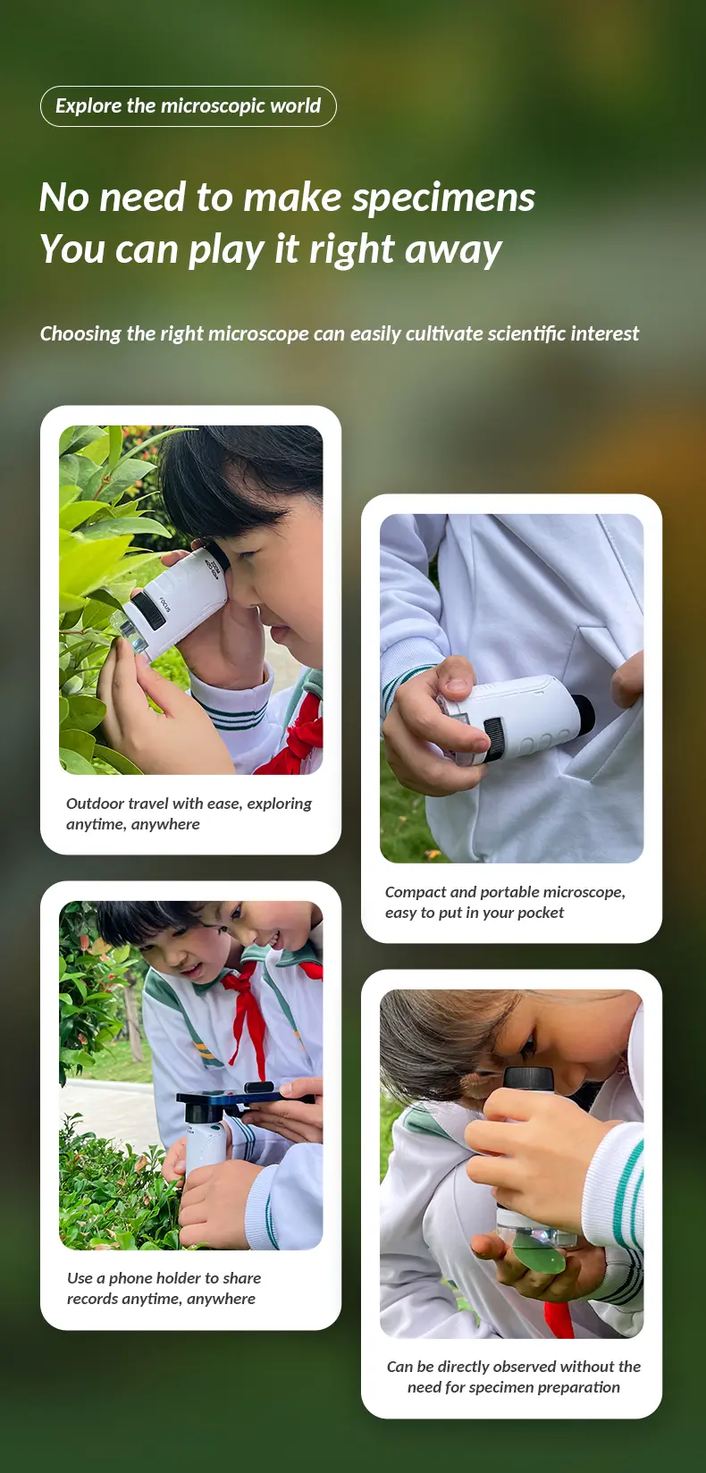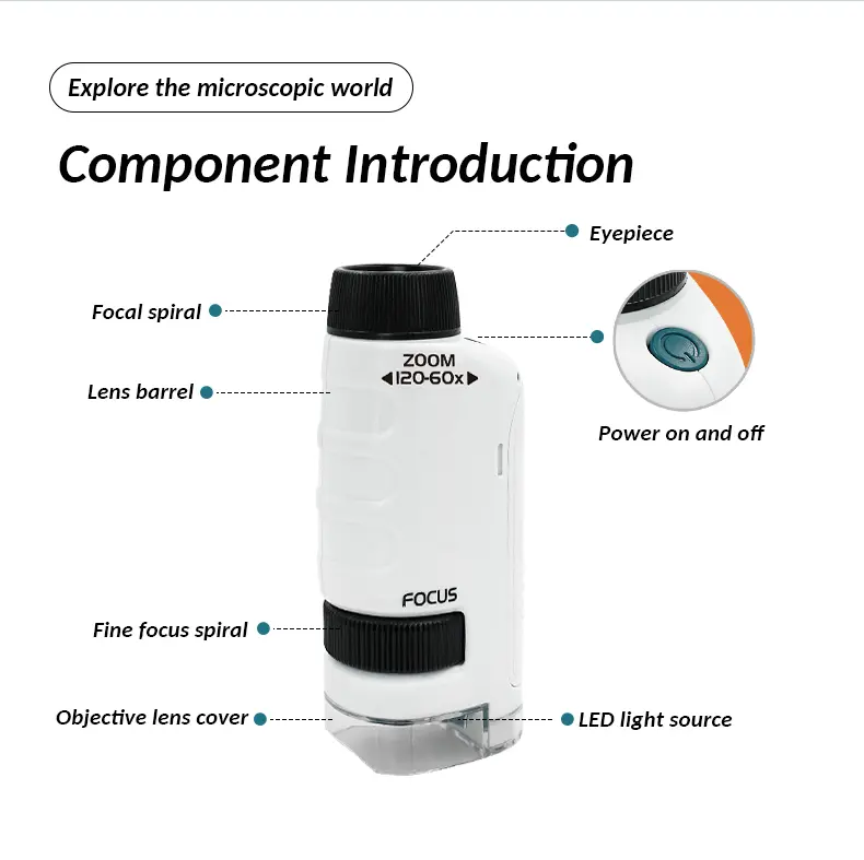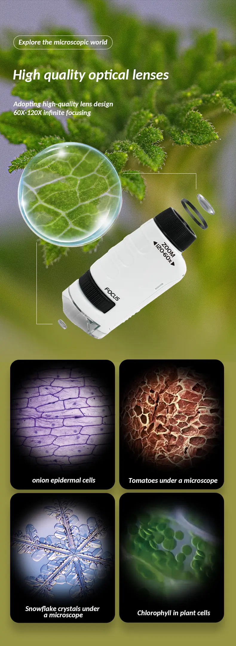 Wholesale 3-in-1 portable microscop toy, anti-lost strap, 60-120X continuous zoom, high-brightness flexible eye-protection LED, no specimen prep needed, smartphone compatible, inspires STEAM exploration.