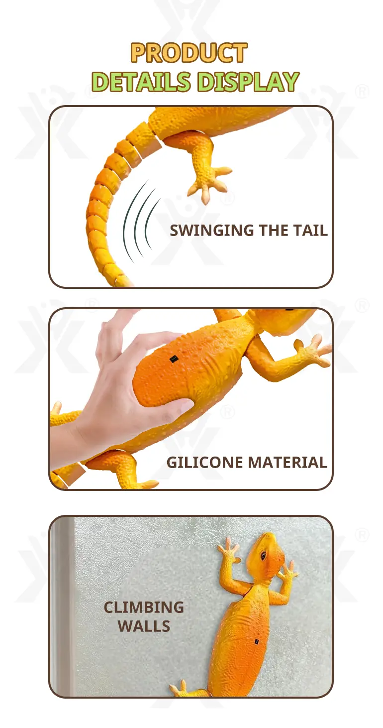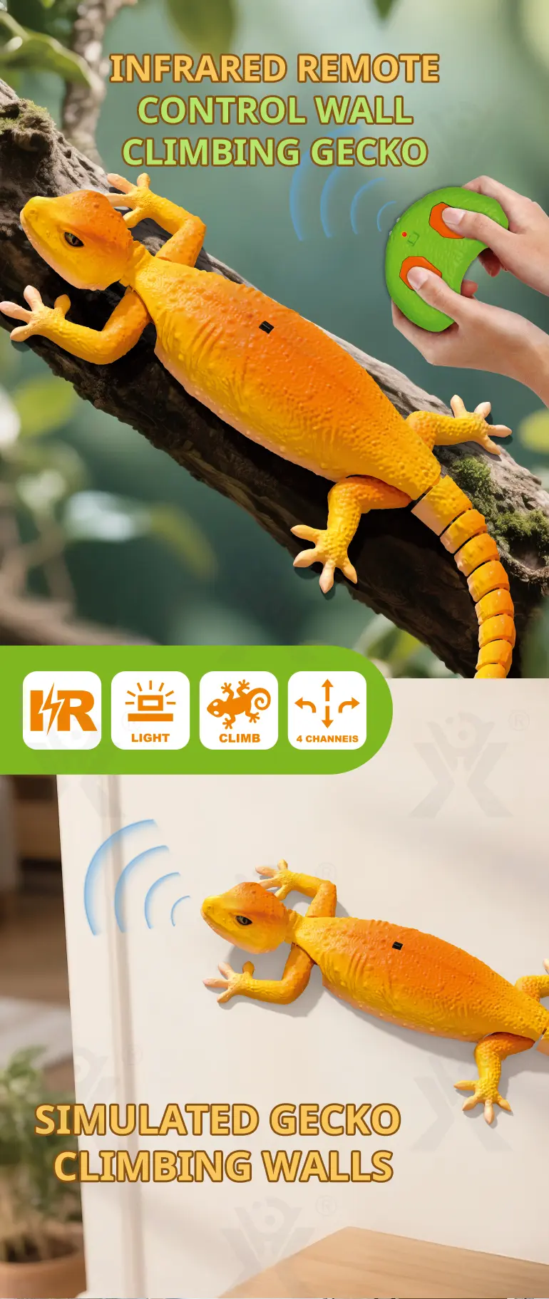Wholesale infrared RC gecko toy with 2.4G remote, 4 channels, silicone suction, tail swing, rechargeable battery, dual-mode play.