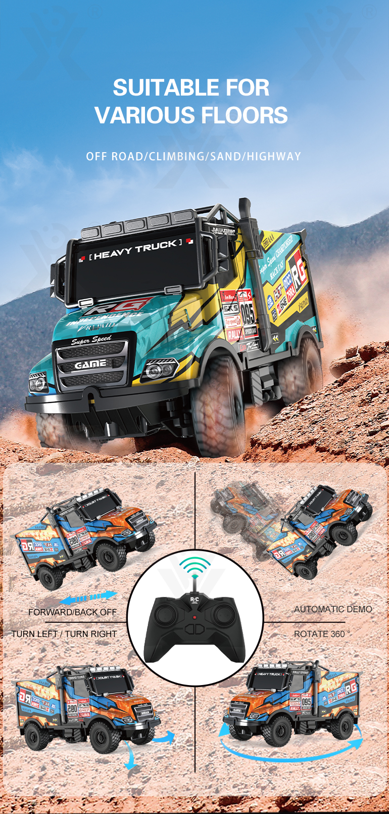 - All-Terrain Capability: This RC truck rally toy is designed for off-road, desert, sand, and highway surfaces with oversized tires.