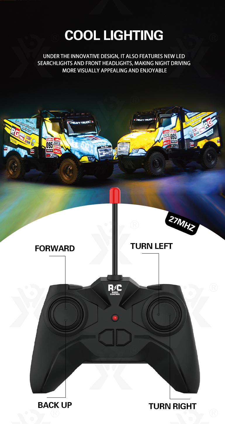 - Cool LED Lighting: Our RC truck rally toy features searchlights and front headlights for exciting nighttime driving.