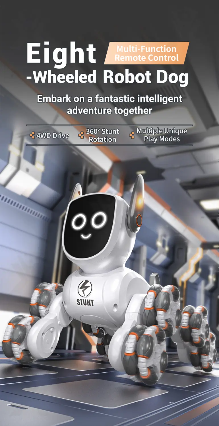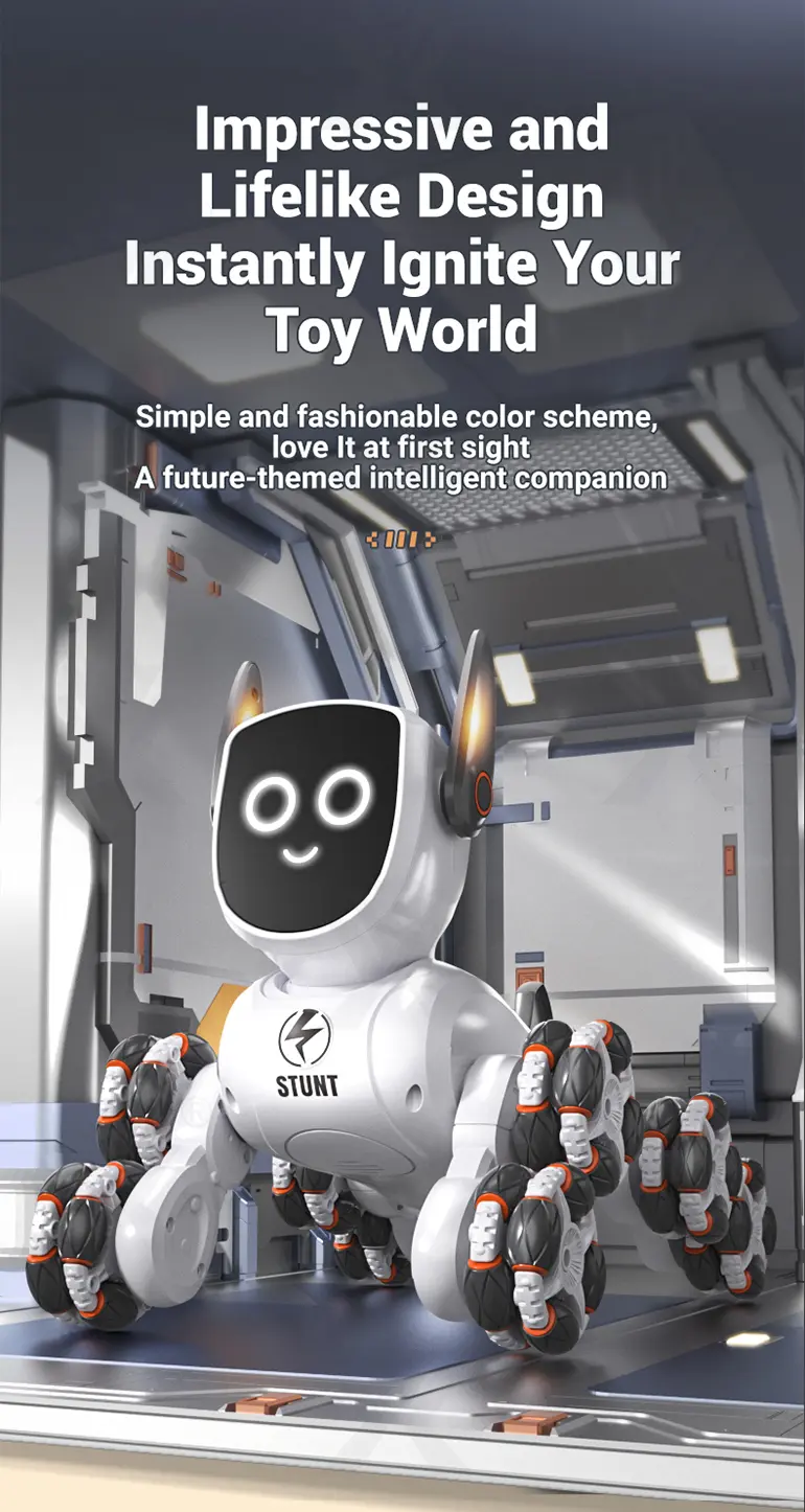 Wholesale 8-wheeled stunt robot dog toy. This 4WD gesture-sensing robot dog features 360° stunt drift, 2.4G remote, multiple modes, dynamic music, and cool wheels for high-tech play.
