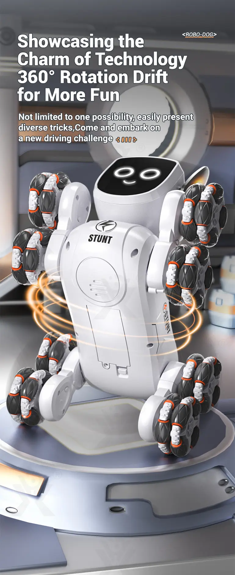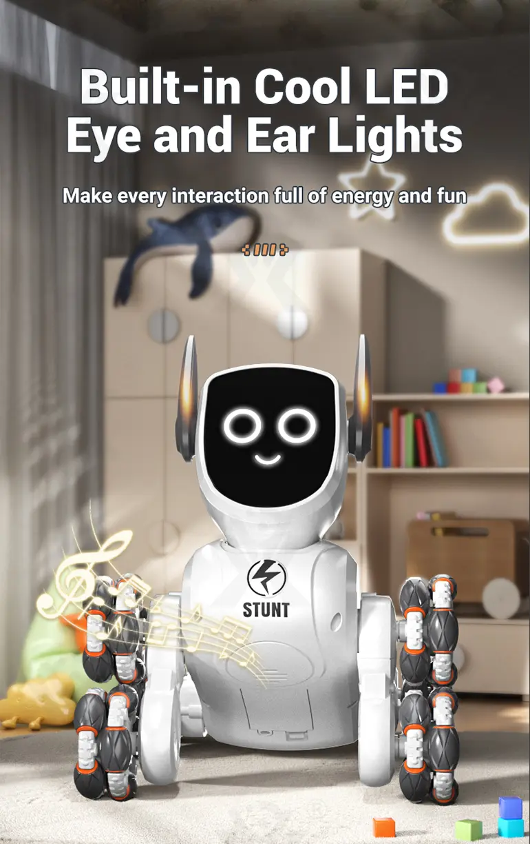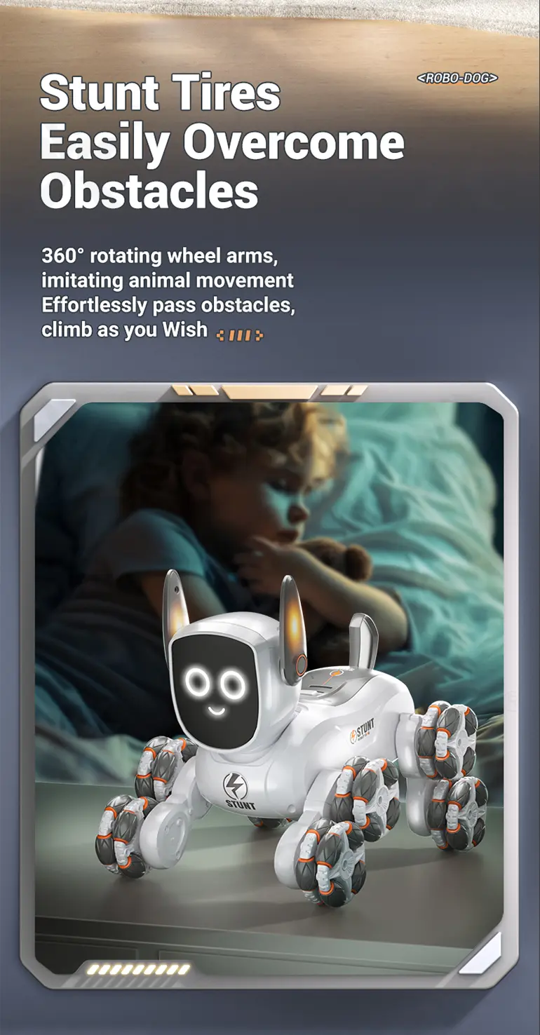 - 360° Stunt Drift & Rotation: The 8-wheeled stunt robot dog toy can perform exciting 360° spins and drifts, offering thrilling stunt driving and endless interactive fun for tech-savvy kids.