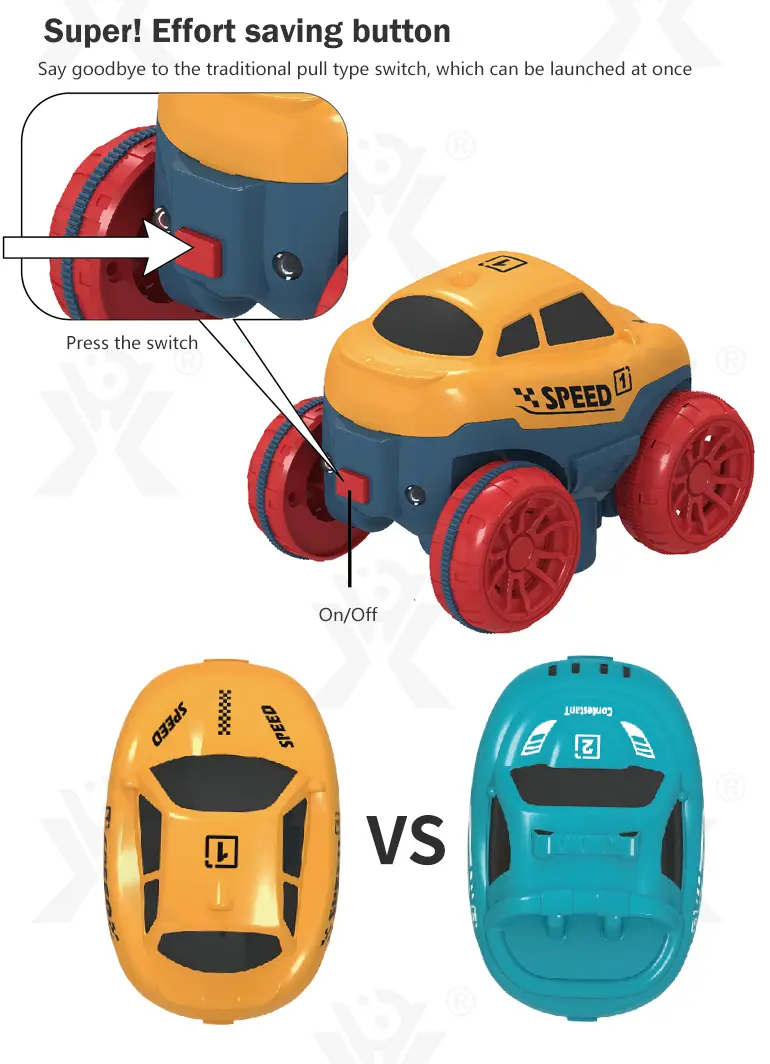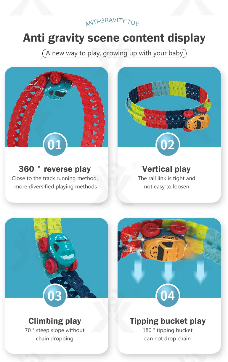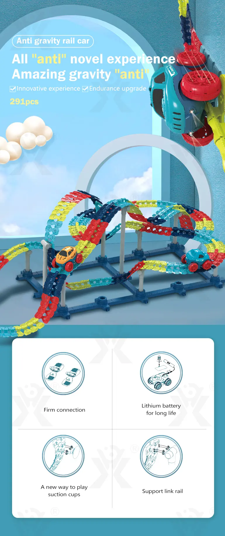 - Anti-Gravity Stunts, Revolutionize Traditional Play: It features innovative suction cup tracks for vertical wall climbing, 360° upside-down running, 70° slope climbing, and 180° bucket flips.
