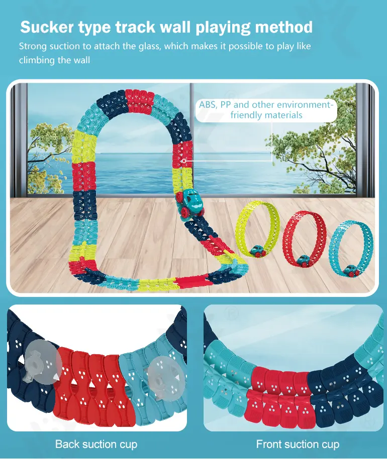 - Suction Cup Track, Strong Adhesion & Secure: With powerful front and back suction cups, it firmly attaches to smooth surfaces like glass and tiles. The tightly connected track remains secure during play.