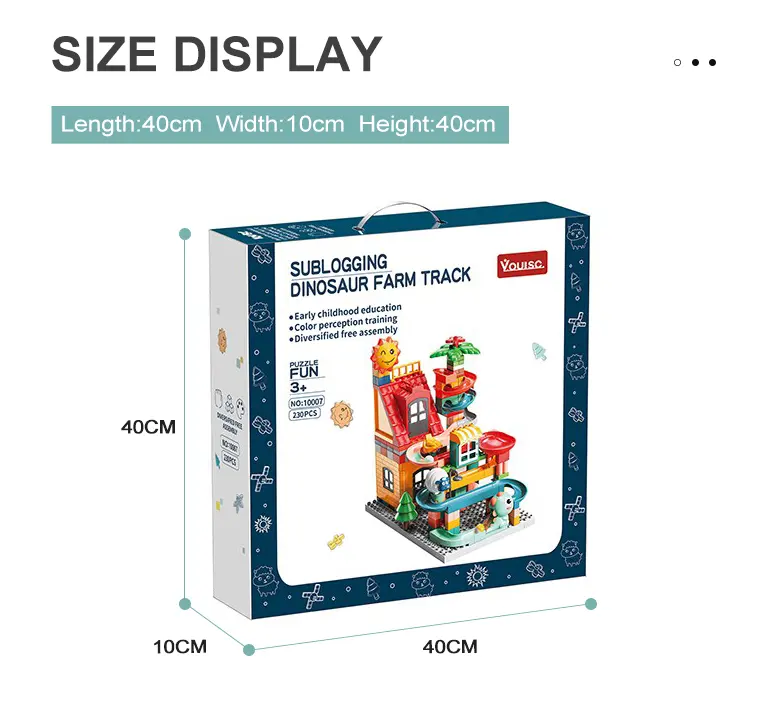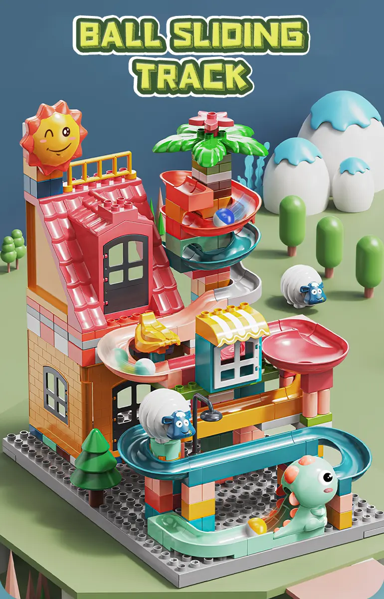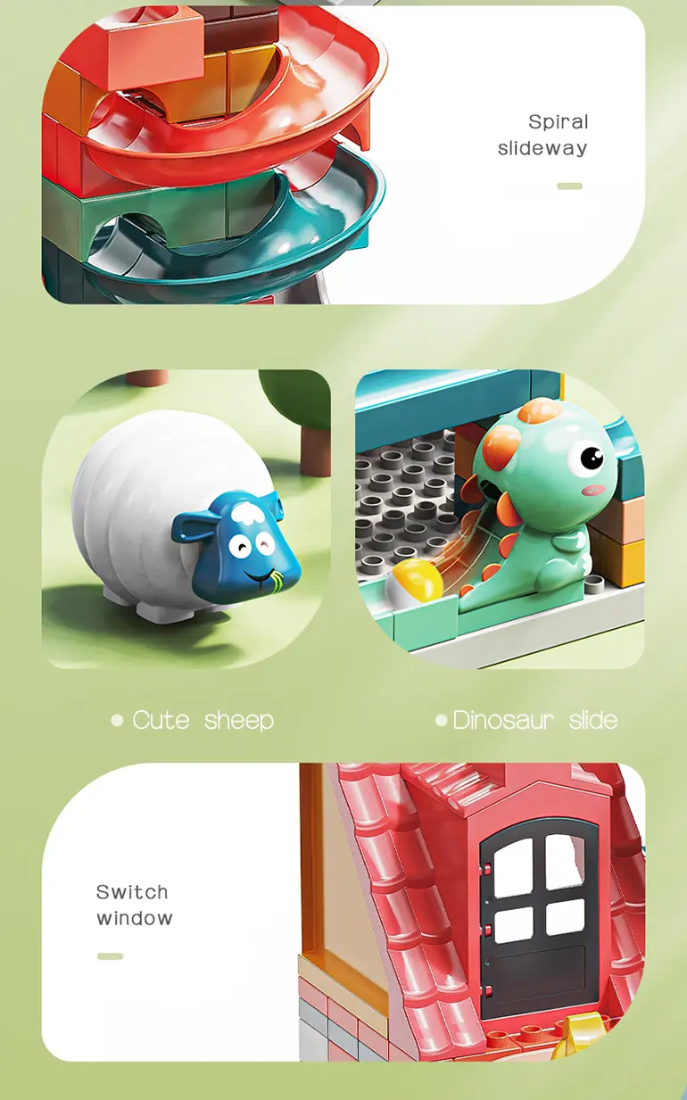 - Dual Theme Spiral Slide Design: Combines dinosaur and farm themes with exciting spiral ball-sliding tracks. This cottage track toy offers continuous rolling action and visual stimulation.
