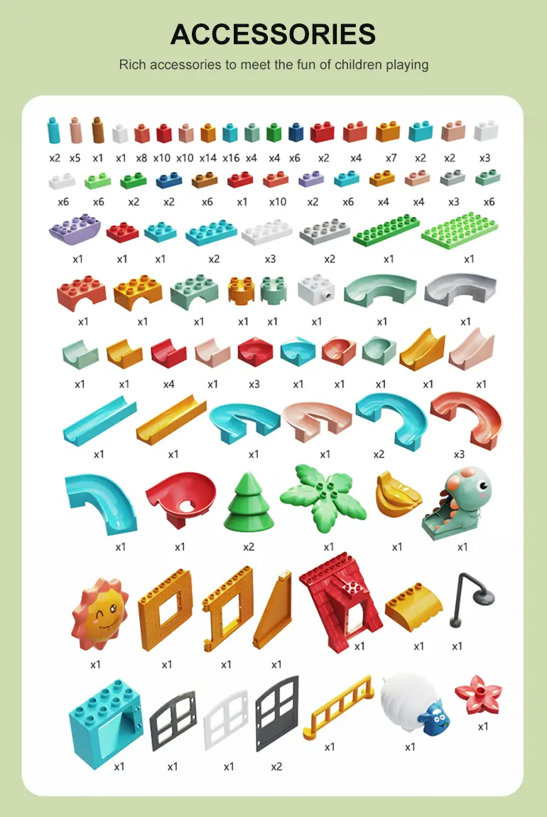 - Rich Accessories for Extended Play: Our wholesale cottage track toy set includes a wide variety of pieces, such as animals, balls, and track connectors to expand play scenarios and encourage creativity.
