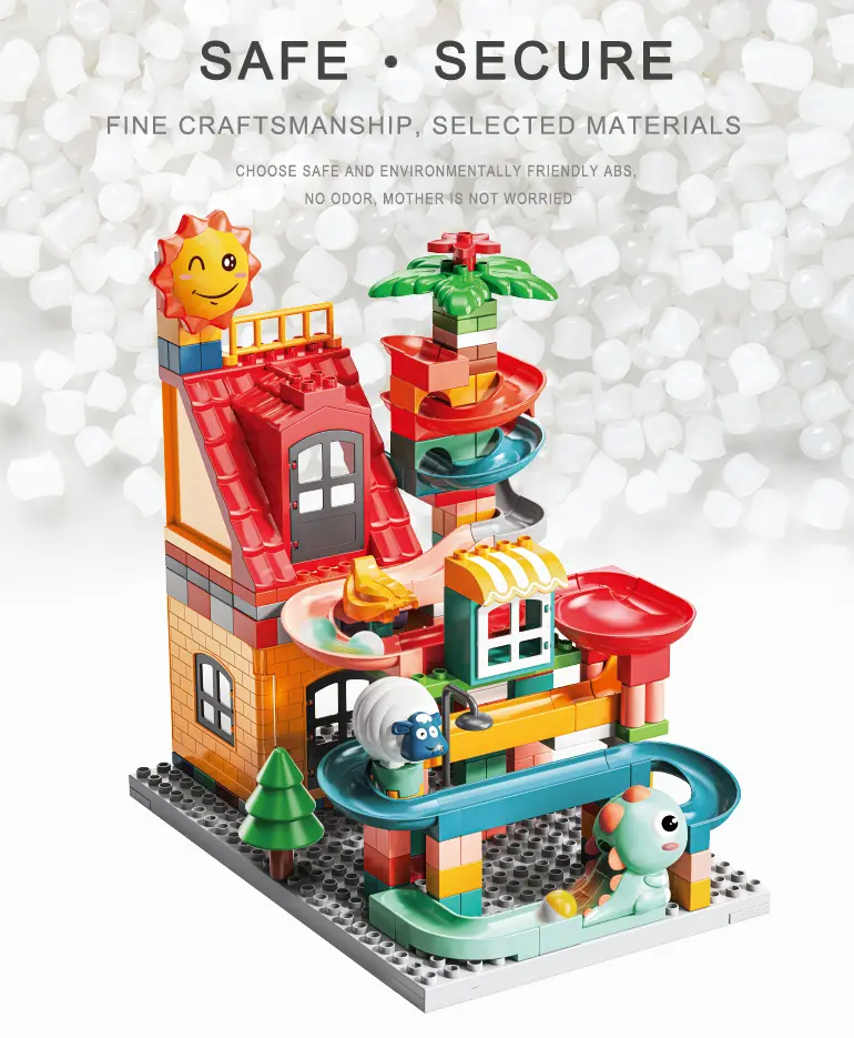Wholesale cottage track toy with spiral paths, rich accessories, safe ABS material, and switch windows for interactive rolling fun.