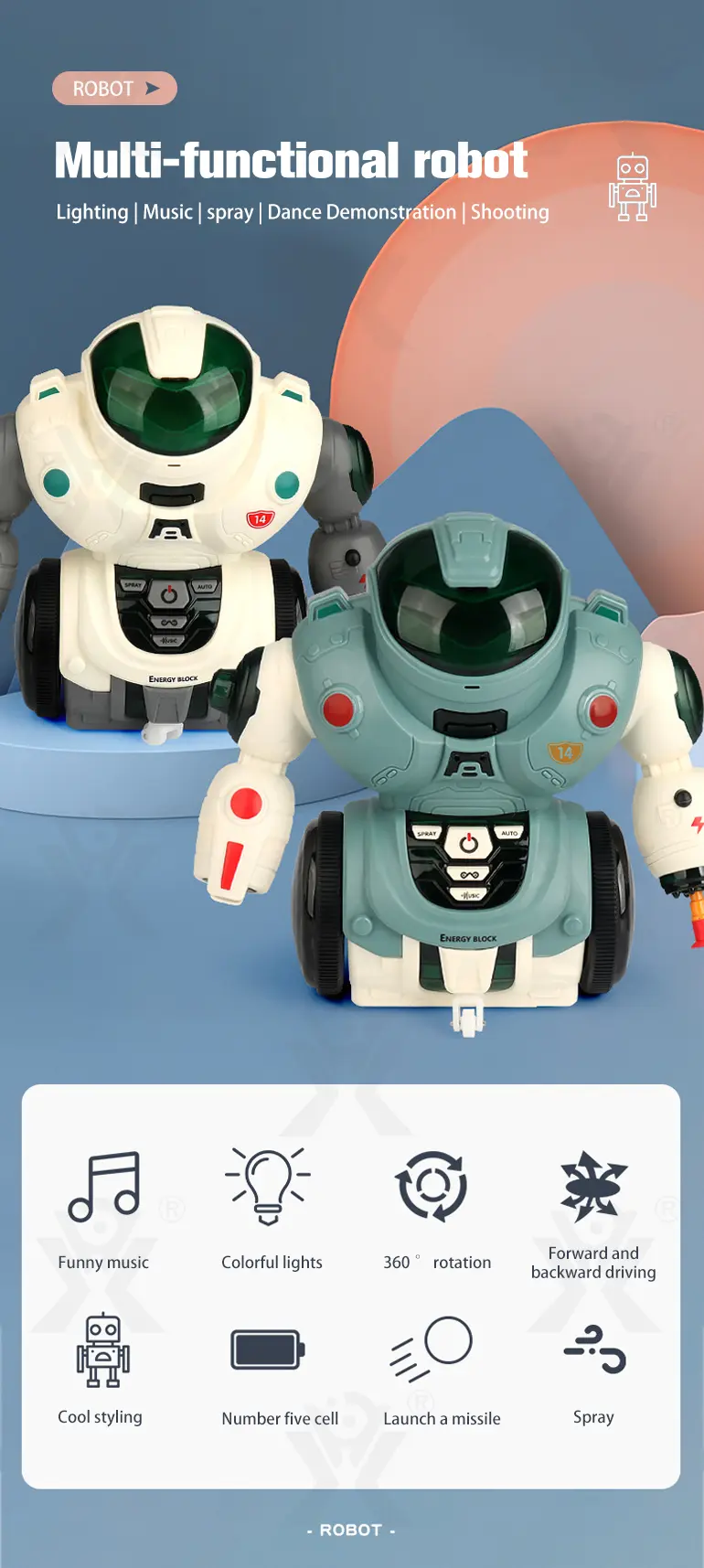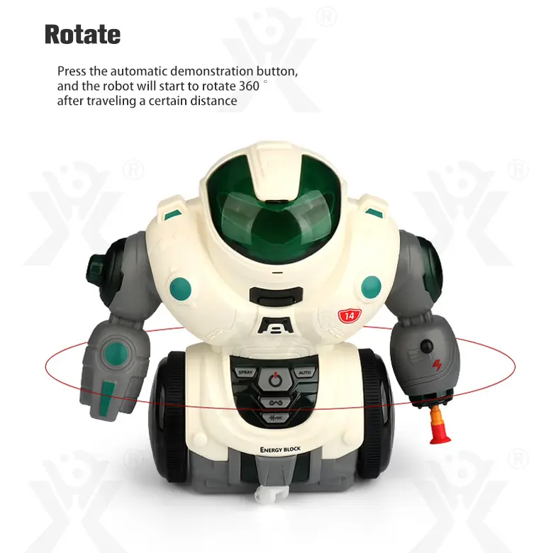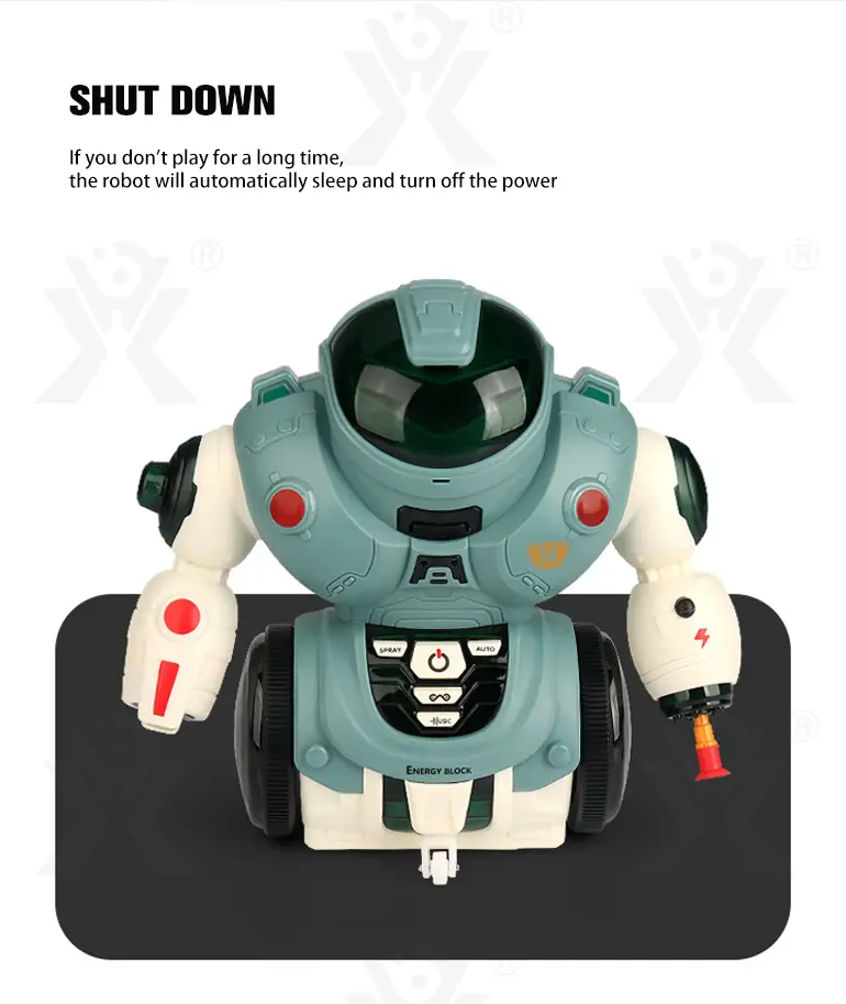 Wholesale electric spray robot, lights & music, 360° rotation, mist spray demonstration, sucker dart shooting, water-play fun, multi-sensory interaction, sparks scientific curiosity.