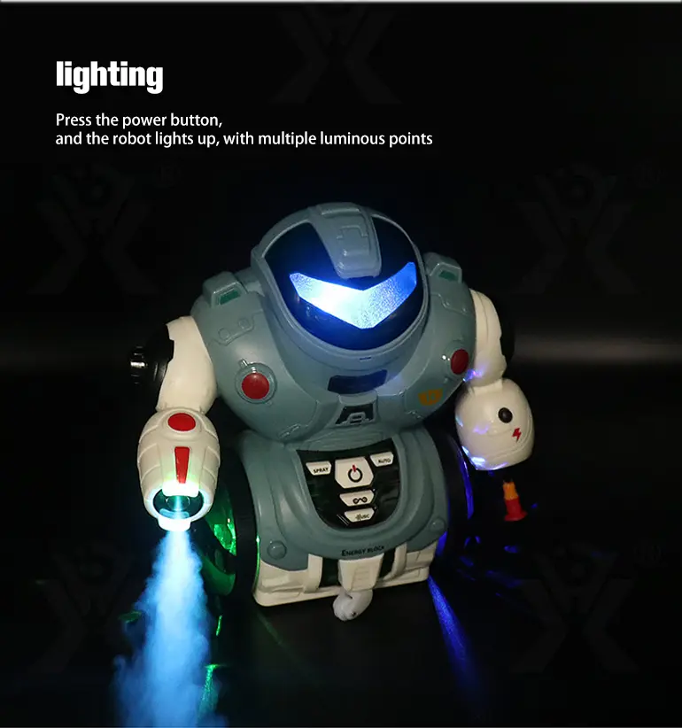This multi-functional robot sprays mist, flashes colorful lights, plays music, and rotates 360°—endless interactive fun for curious kids. -