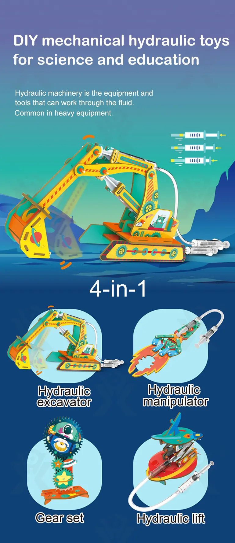 DIY Hydraulic Machinery 4-in-1 STEM Set – Excavator, Manipulator, Gear Set & Lift