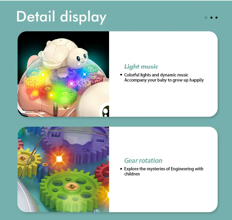 This interactive electric gear turtle features bright lights and cheerful music alongside rotating gears to engage kids in sensory play and early STEM concepts. -