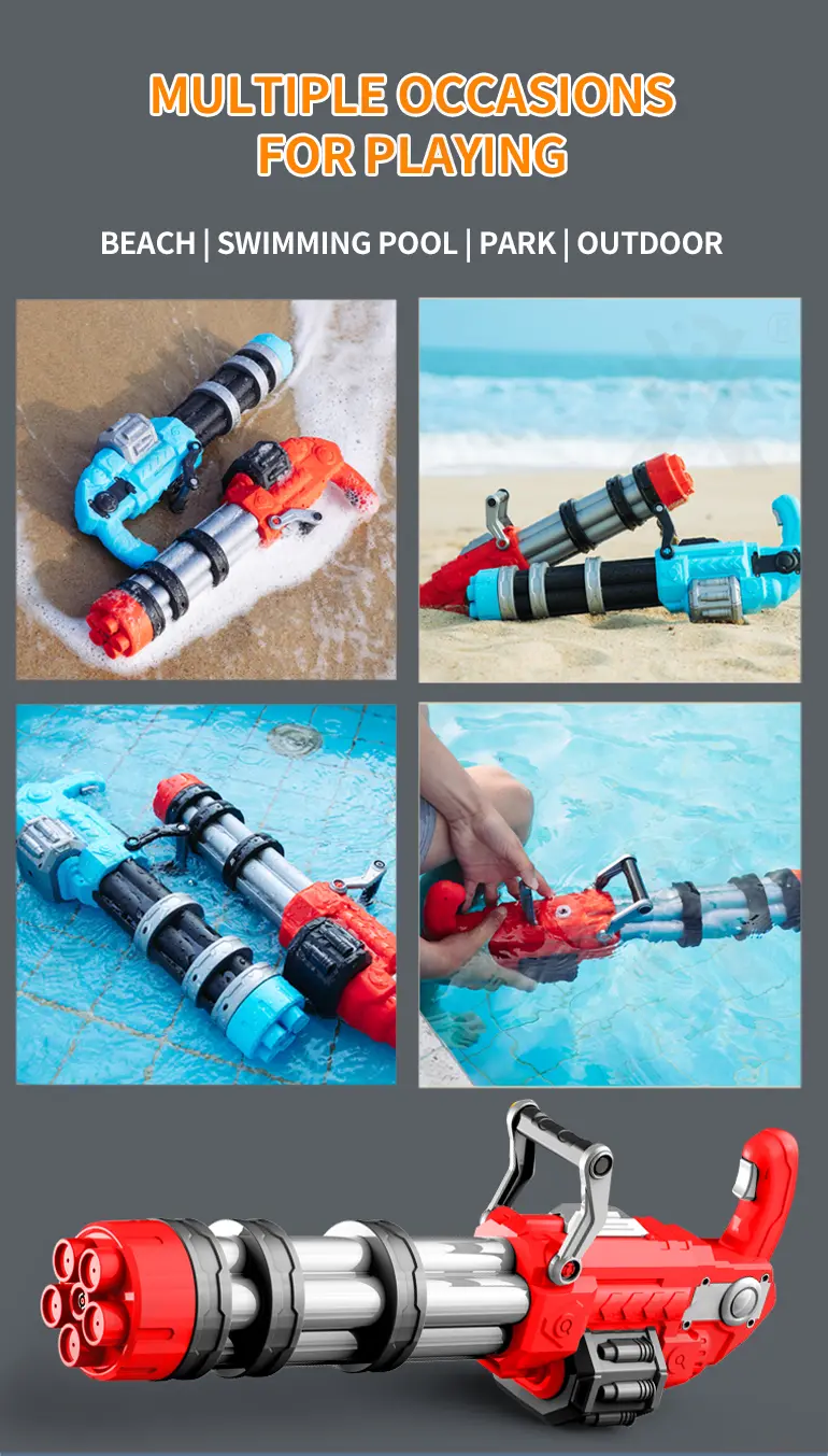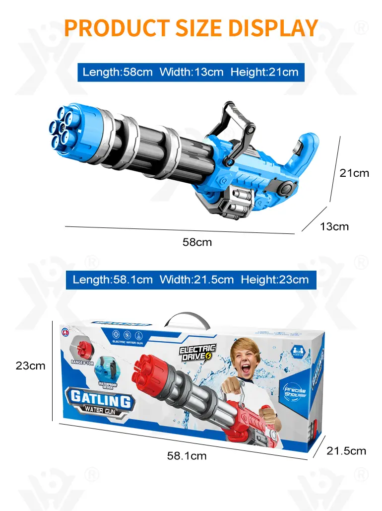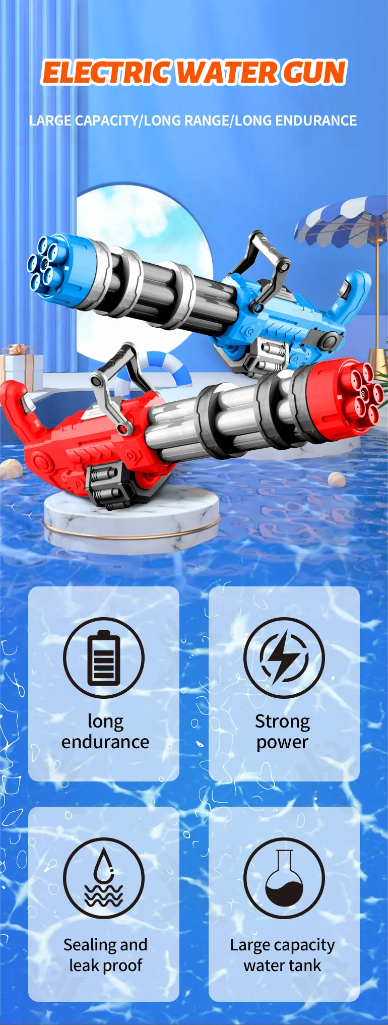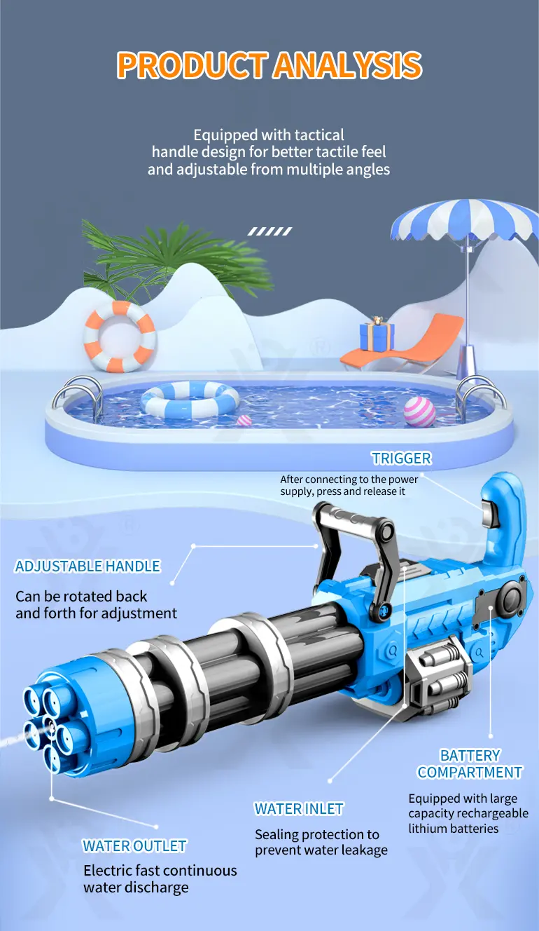 Wholesale electric Gatling water gun, large water tank, long battery life, long-range strong stream, adjustable handle, waterproof design, perfect for beach, pool, park & outdoor fun.