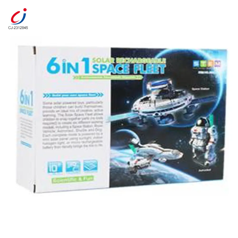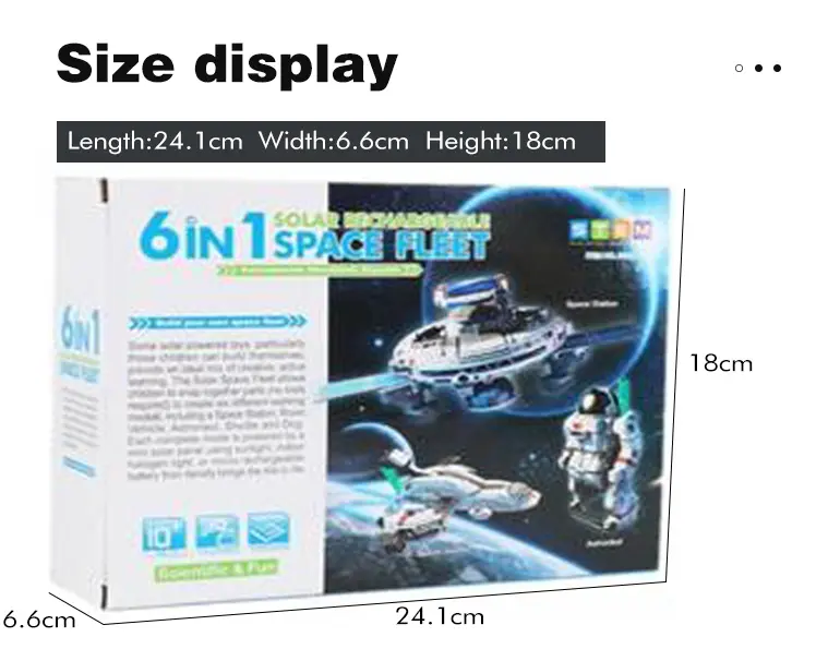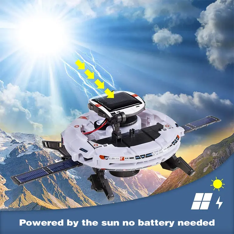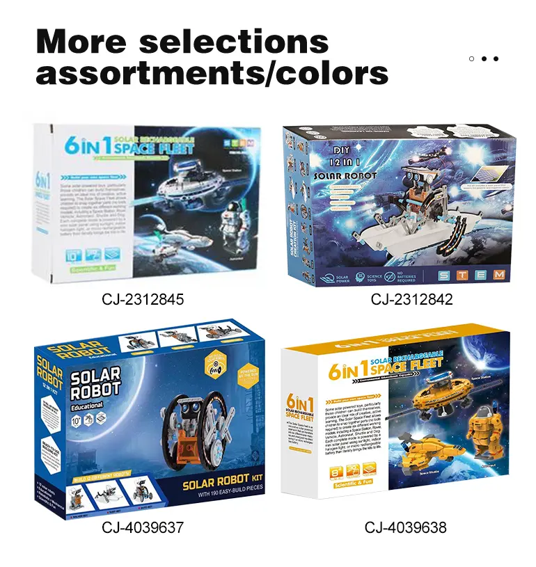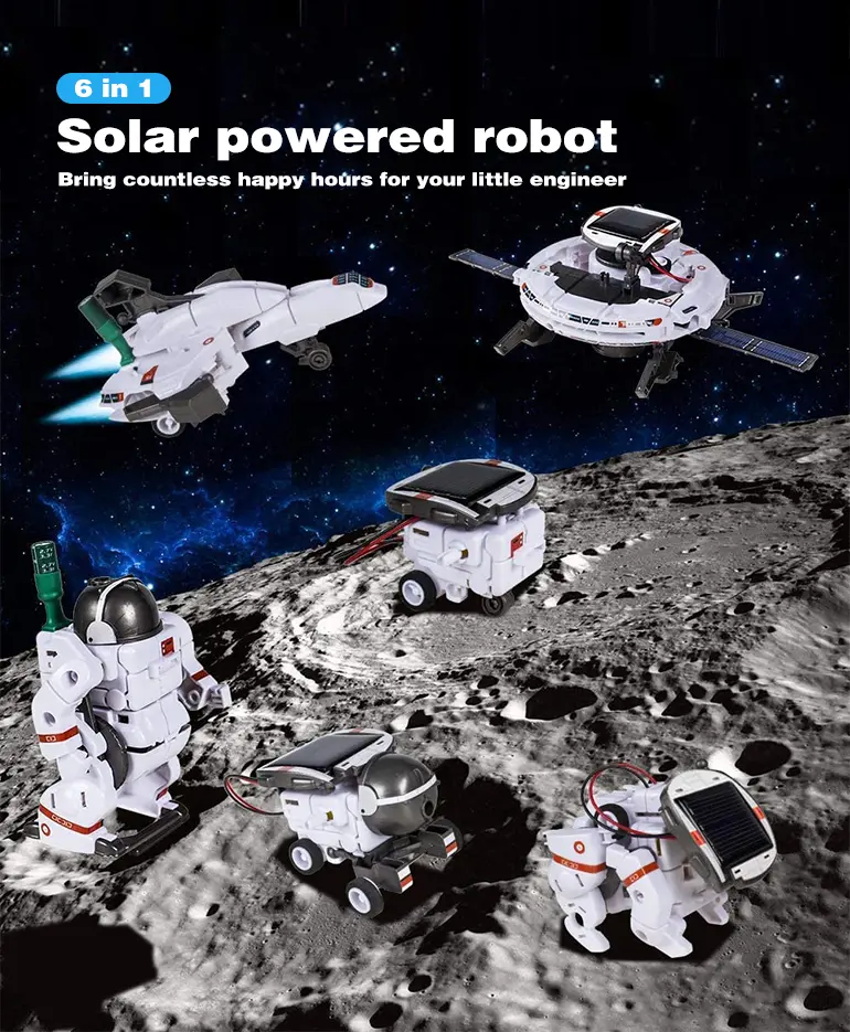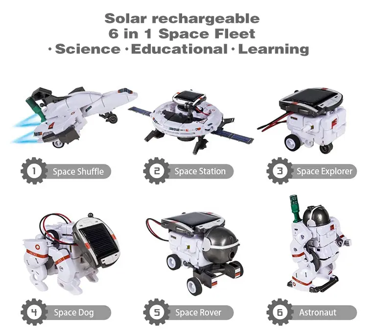 - 6-in-1 Space Fleet Set: This solar robot toy contains a shuttle, a station, an explorer, a rover, a space dog, and an astronaut.