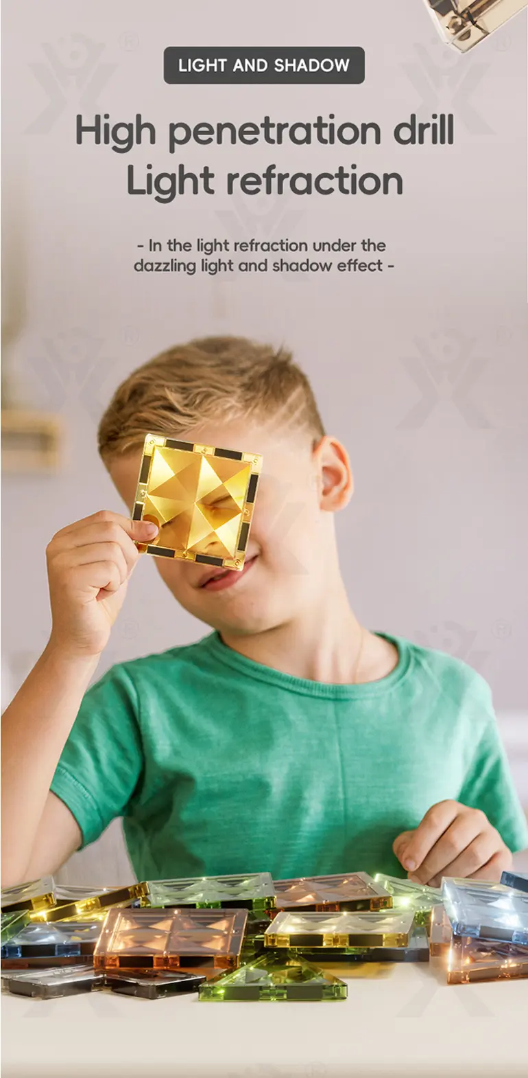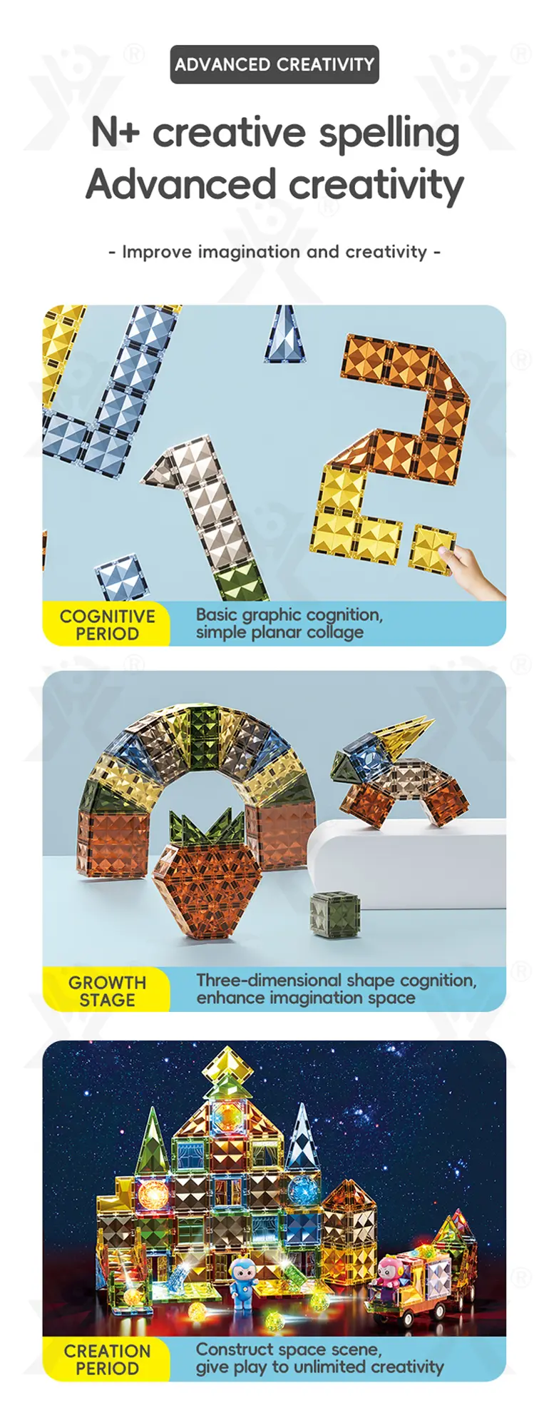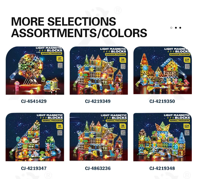 Bulk jadeite magnetic building blocks with dazzling night lights, diamond-cut natural colors, and N+ creative combos for 3+ imagination and STEM and creative fun.