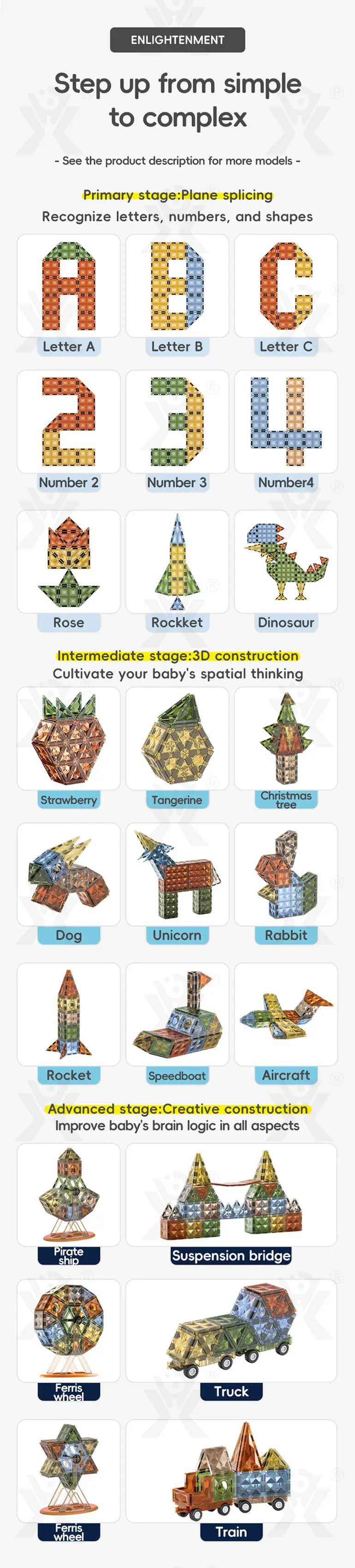 - Stage-Based Cognitive Development: Basic shape recognition → planar collage → 3D construction → spatial storytelling for ages 3+.