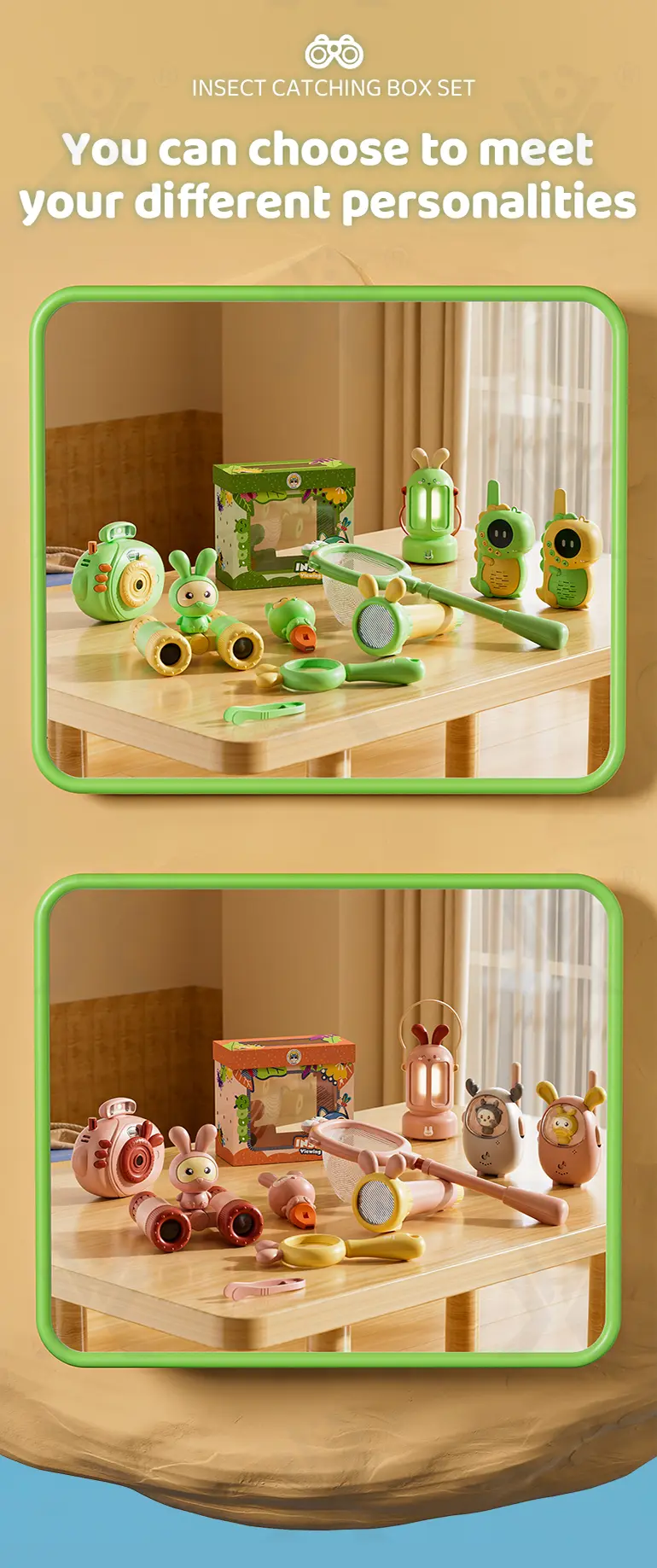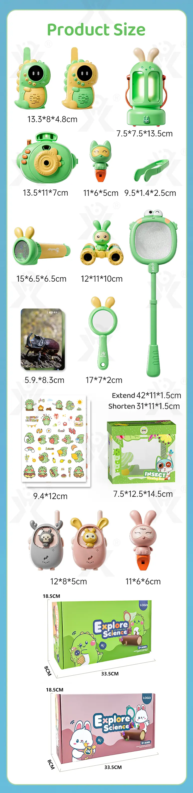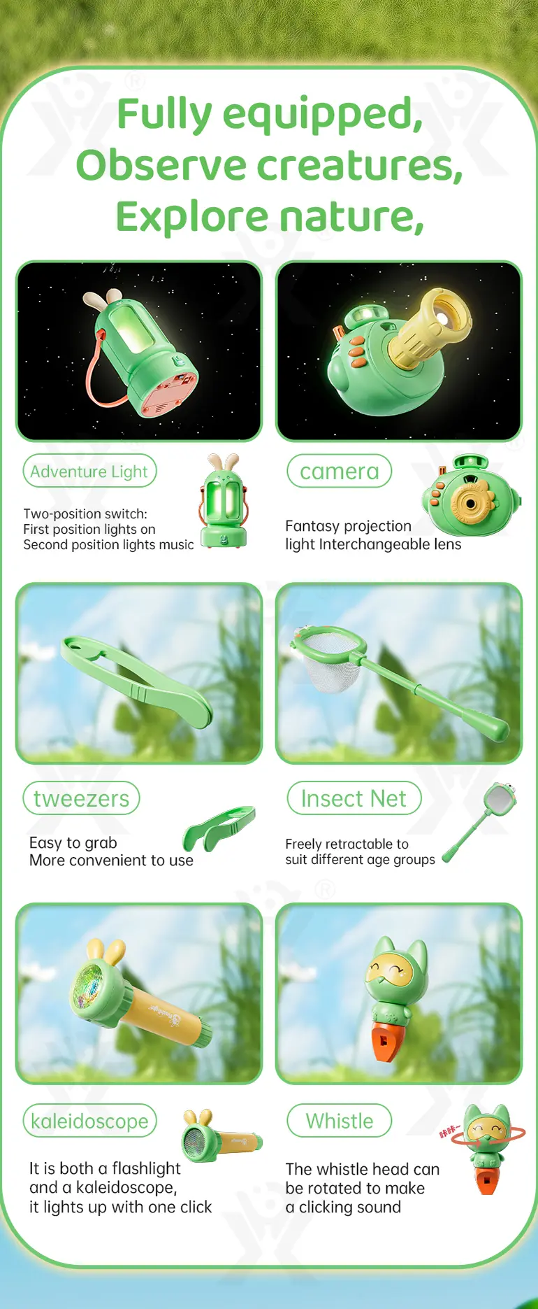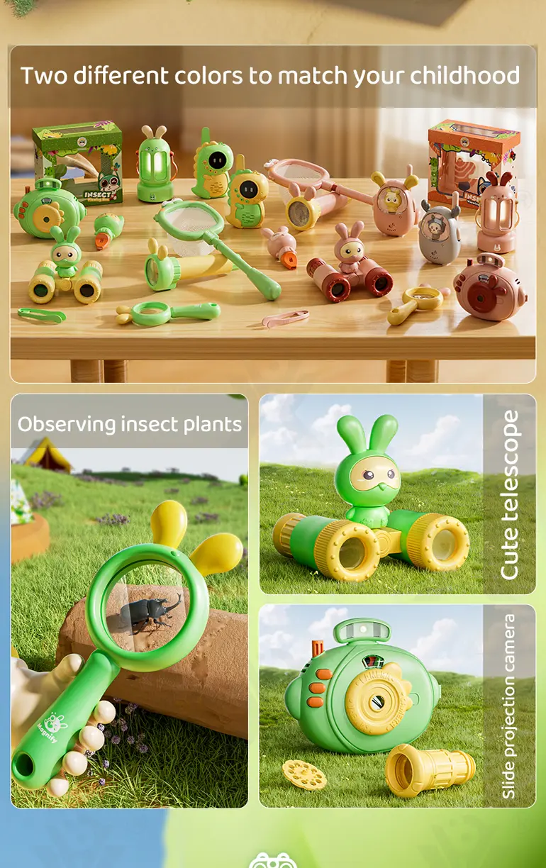 - 12-in-1 Multi-Function Exploration Set: It includes an insect net, an observation box, a telescope, a projection camera, a walkie-talkie, a magnifier, etc., for full exploration.