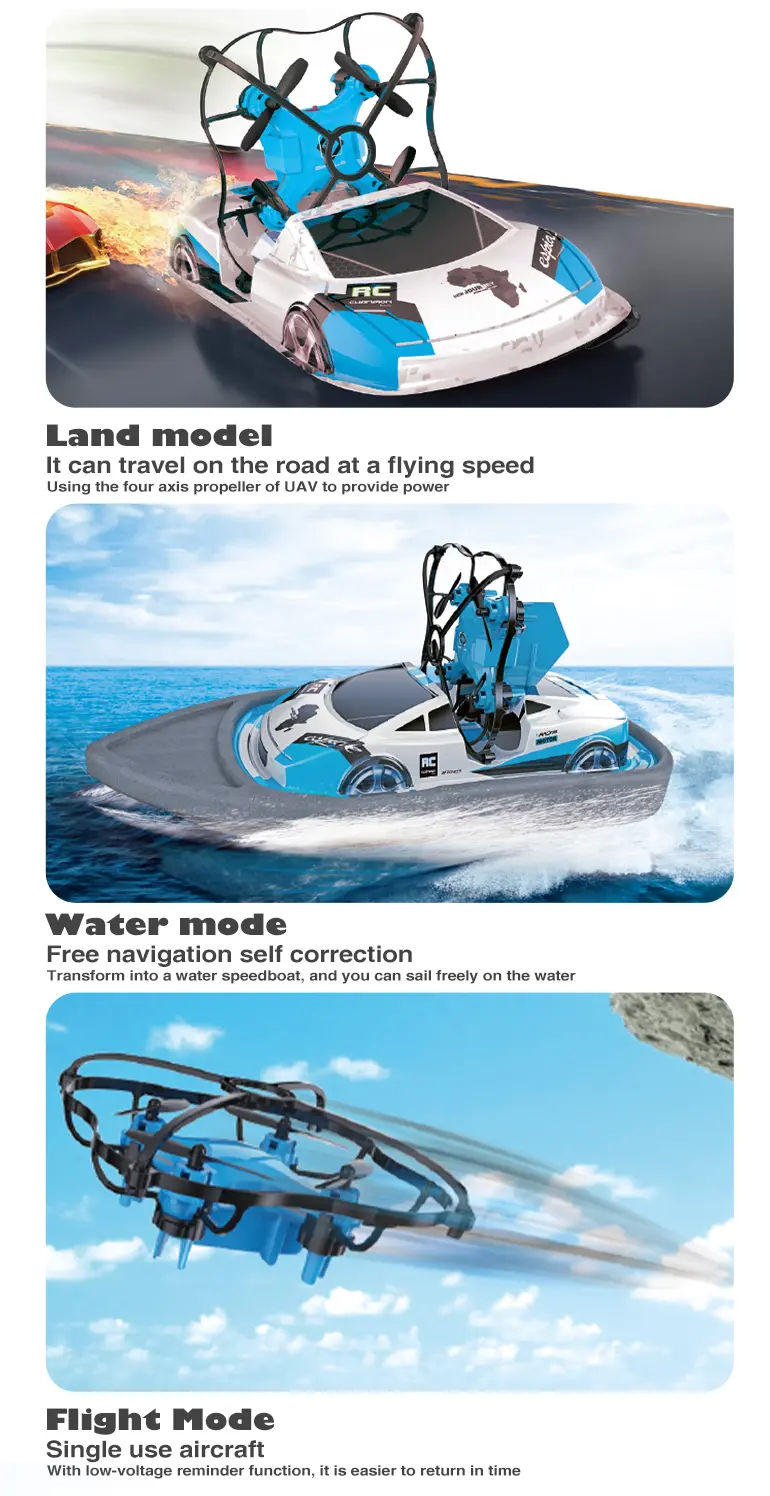 Wholesale RC toys with 2.4GHz, a 3-in-1 RC transformer toy! It combines a drone, a car, and a boat in one. 360° flip, headless mode, one-key return for ultimate landings —these support kids’ fun adventures. Supported bulk purchase. Contact for a quote now!