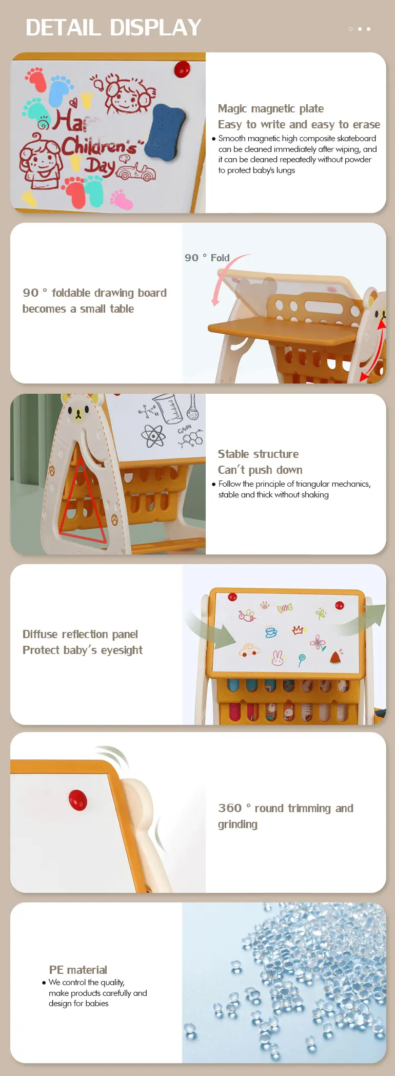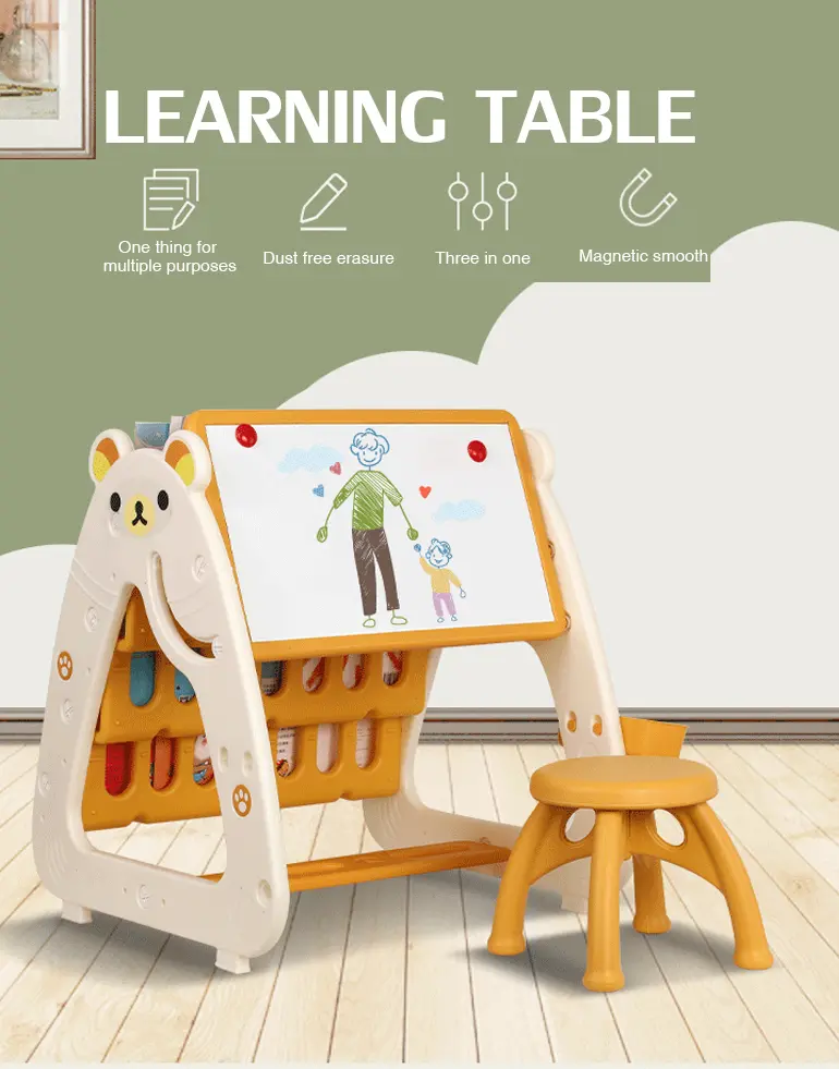 Wholesale three-in-one study table for kids’ learning. Our wholesale 3-in-1 study table includes a drawing board, desk & bookshelf! It features magnetic dust-free writing, 90° foldable design saves space. The stable triangle structure protects kids’ eyes & health. Available in bulk supply. Contact us now!