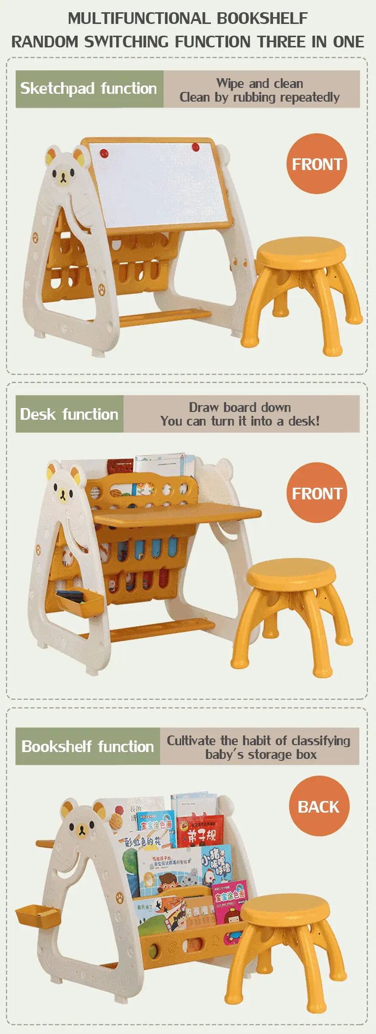 - 3-in-1 Versatility, Switch Modes as You Like: Our 3-in-1 study table for kids combines a drawing board, desk, and bookshelf. The board folds into a desk with storage shelves on the back, meeting all learning, drawing, and storage needs while saving space.