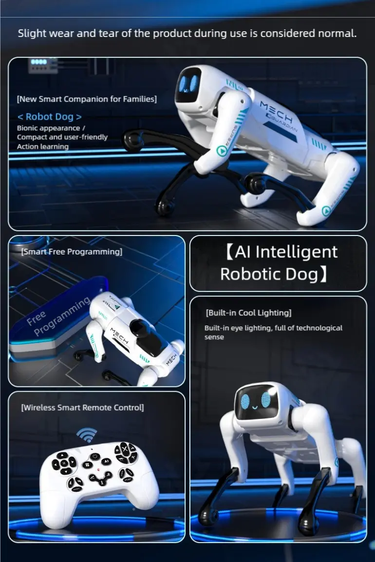 Wholesale AI mech robot dog toy with voice recognition, bionic design, flexible movements, free programming, and cool lighting – your family’s tech companion.