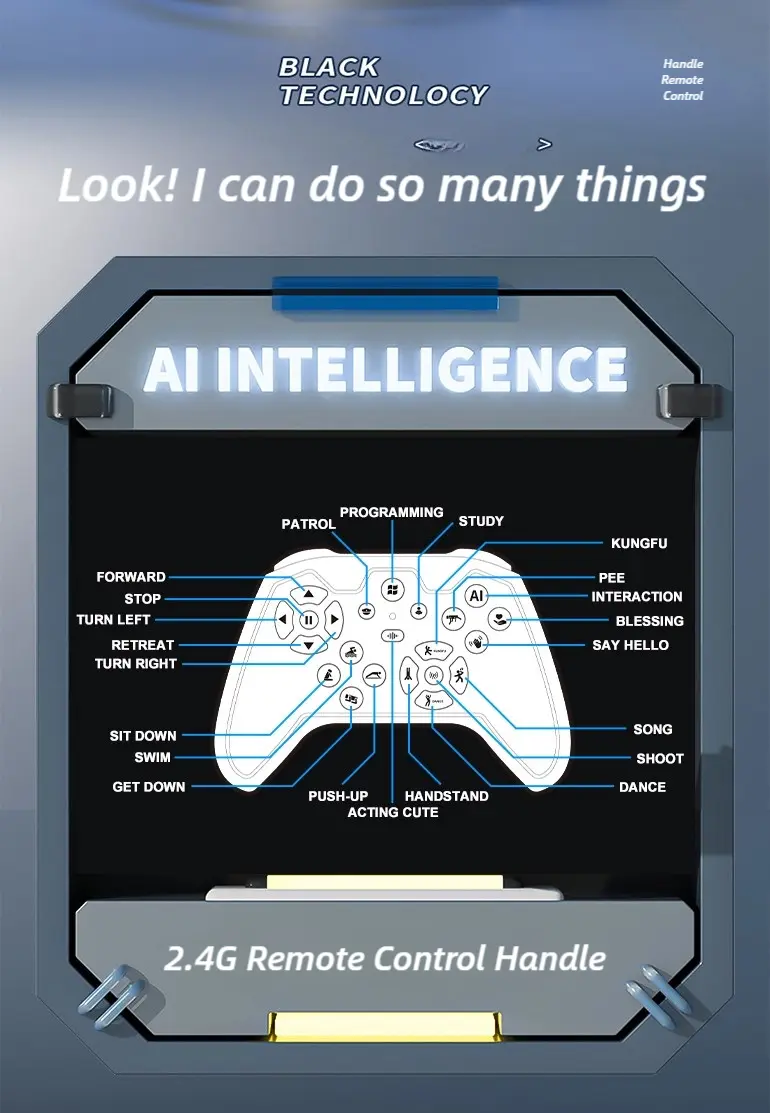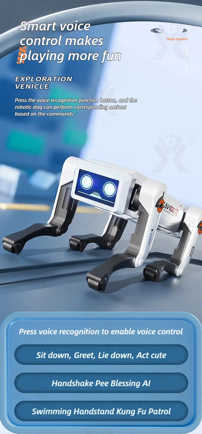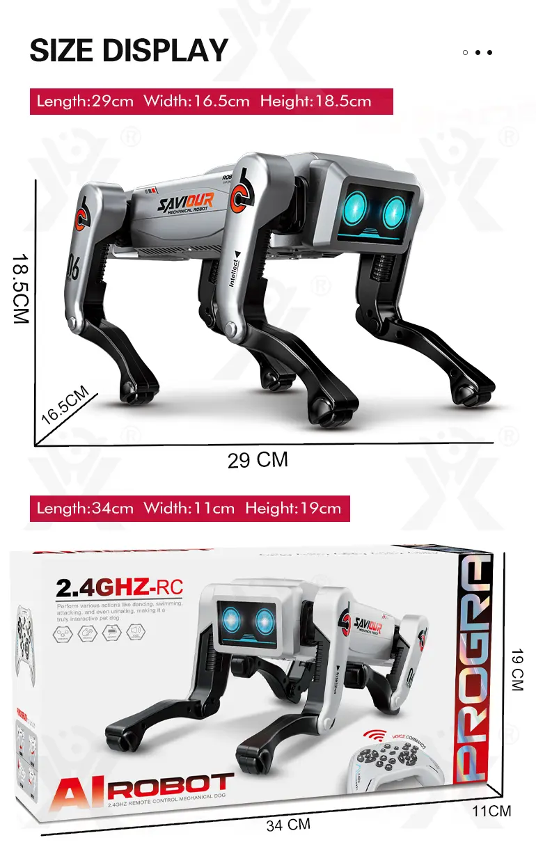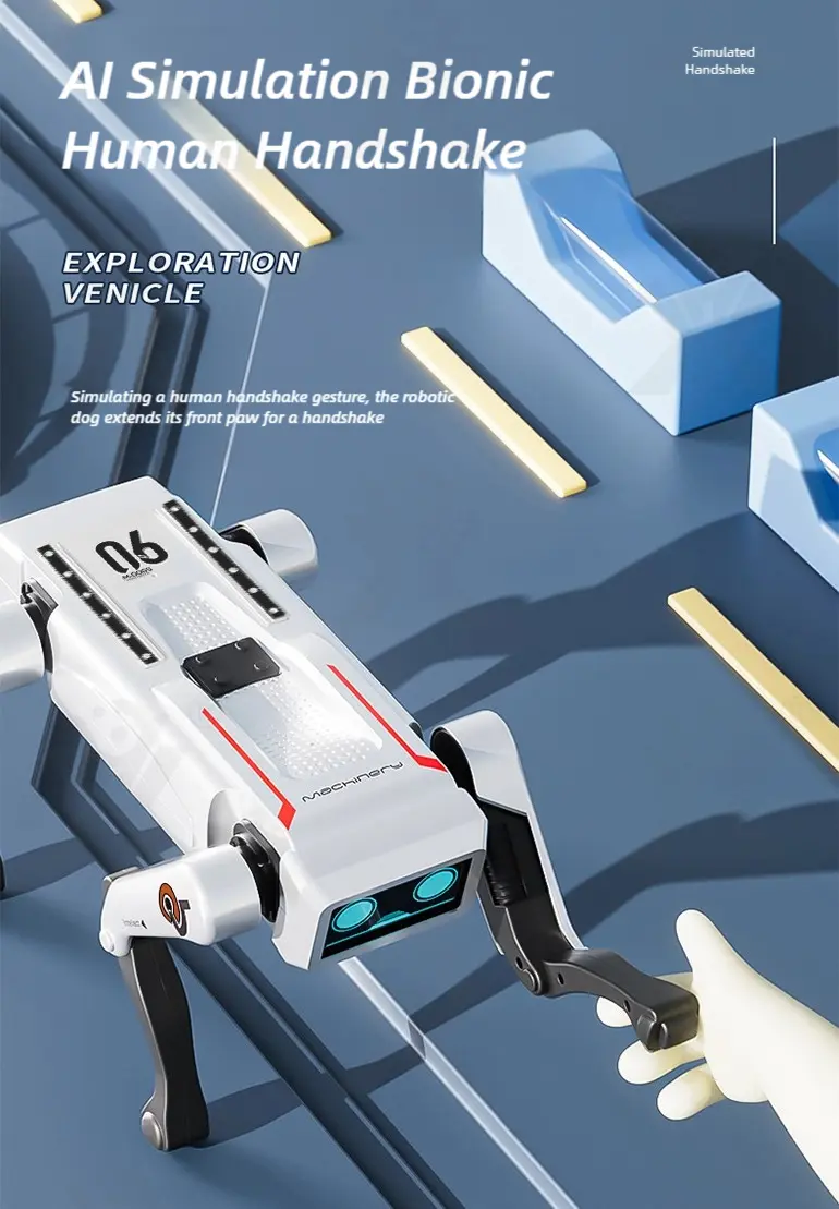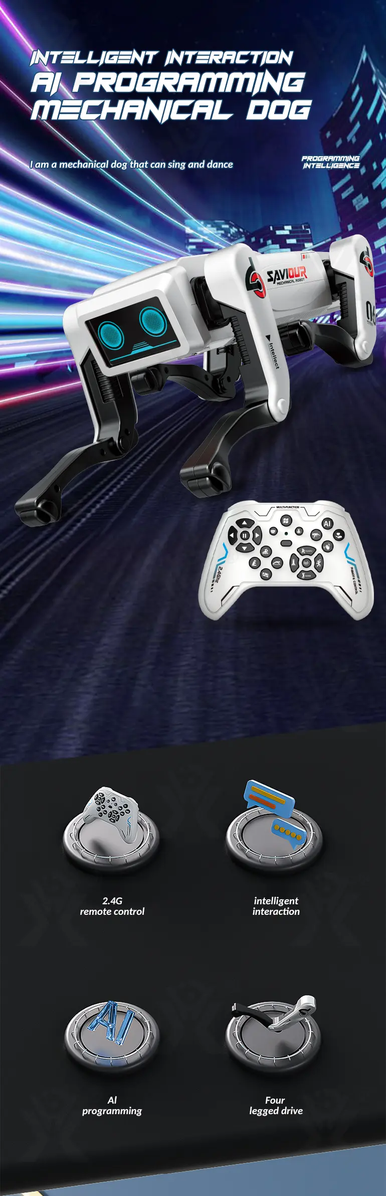 Wholesale AI voice recognition & 2.4G remote control intelligent mechanical robotic dog toy. It features singing, dancing, handshake, 20+ actions, bionic interaction, and smart programming for fun learning.