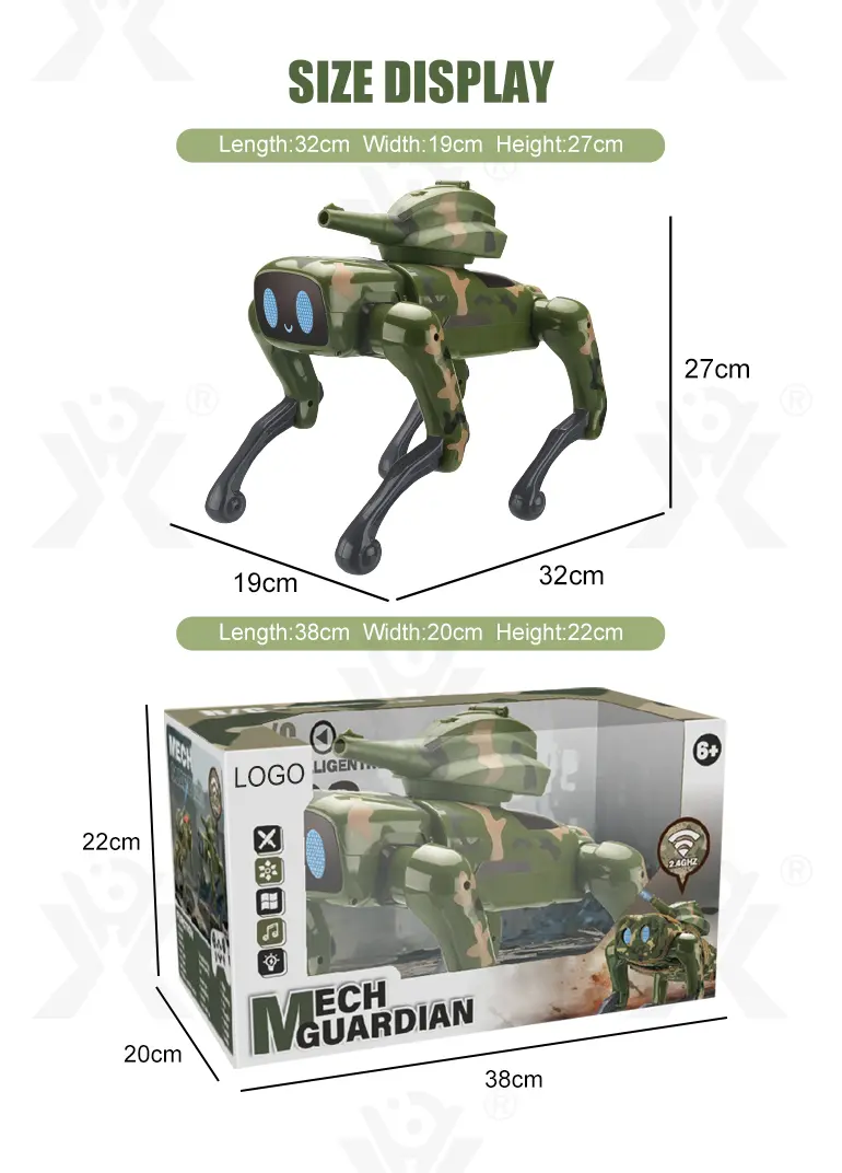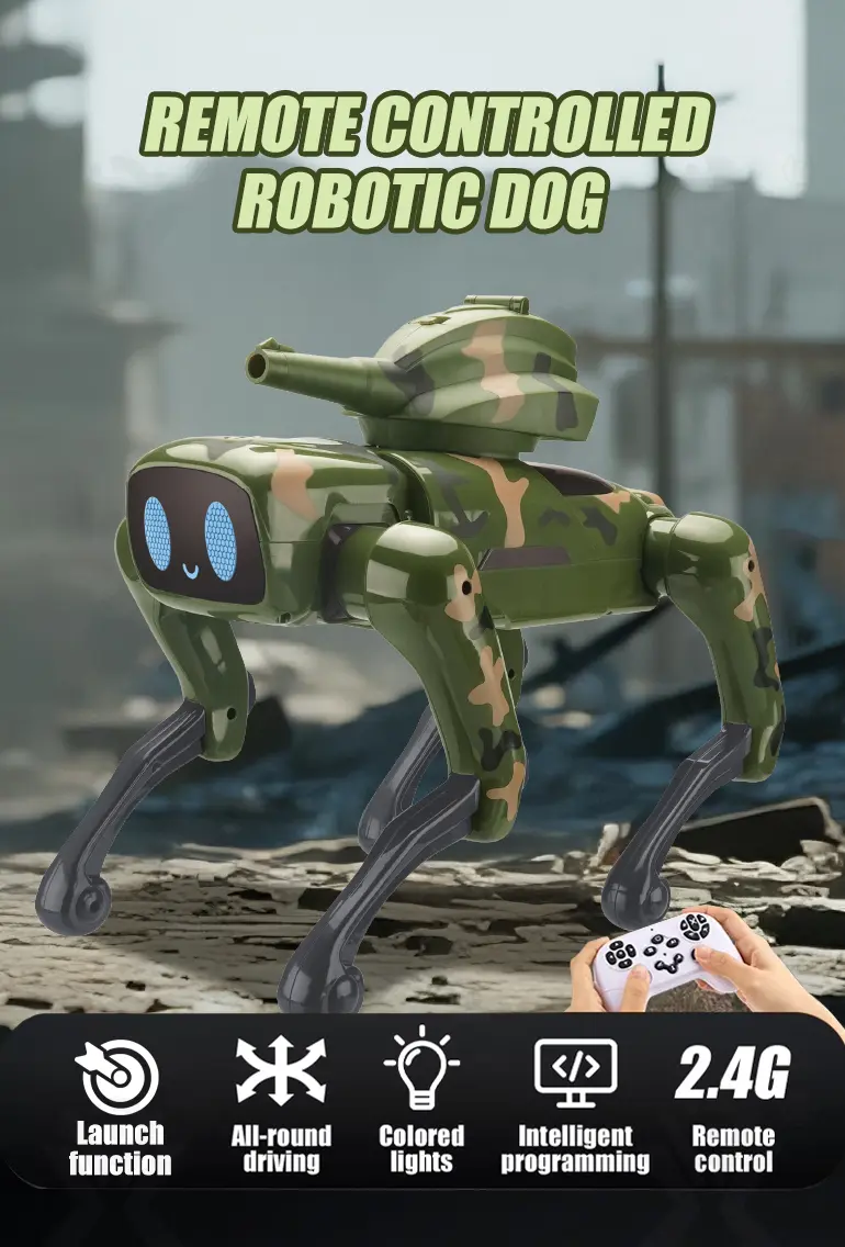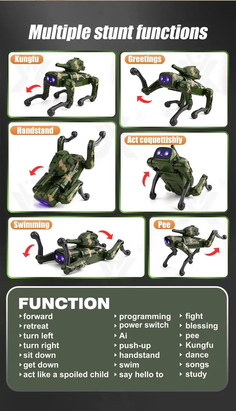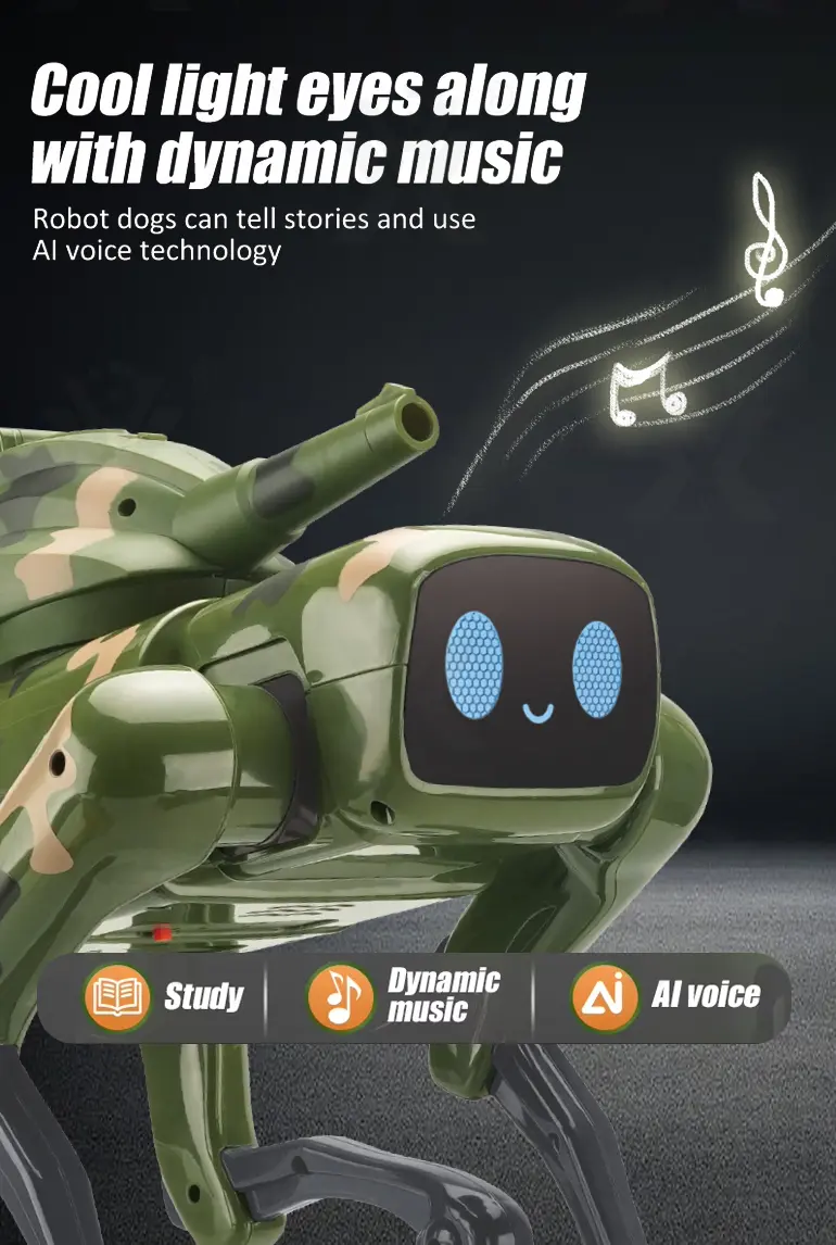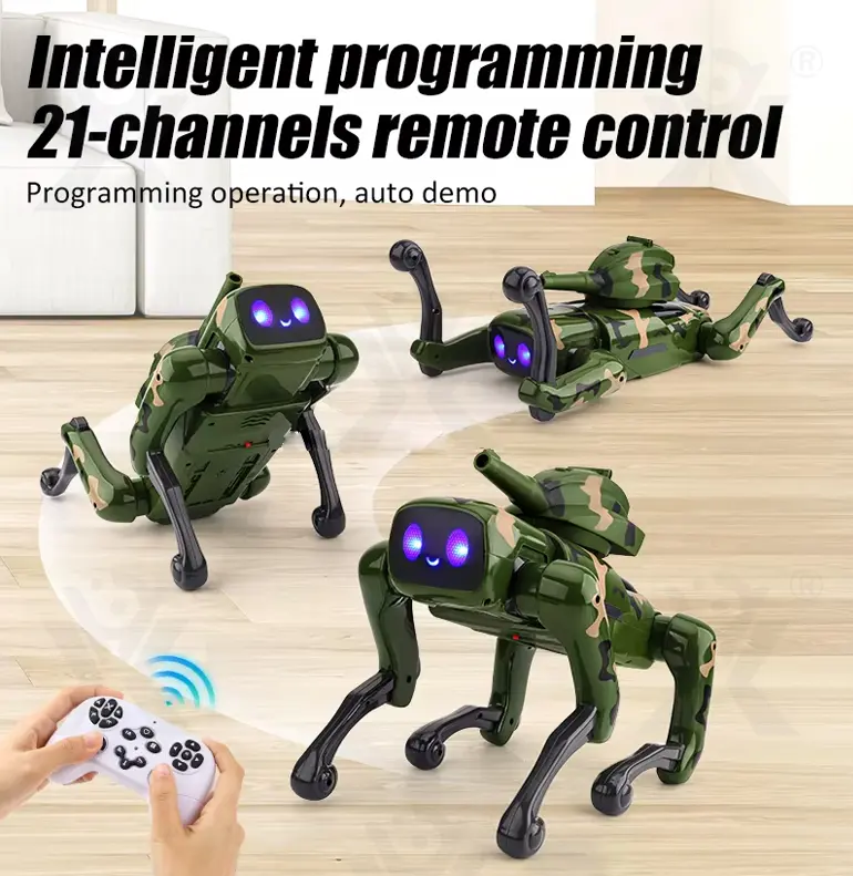 Wholesale AI robot dog toy, with a camouflage outfit! Our robot dog toy features a 21-channel full-function with AI voice, programming learning, multiple stunts, cool lights, and music.