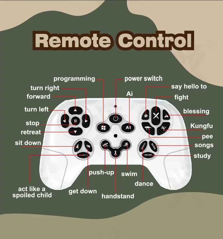 - Full-Function Remote Control: 21-channel precise remote control enables omnidirectional movement, including advance/retreat, turning, kung fu, handstand, and swimming.