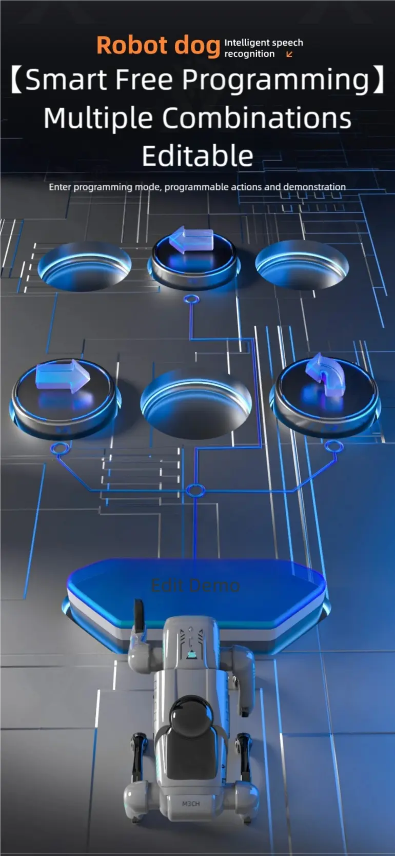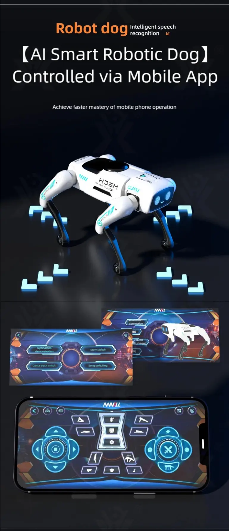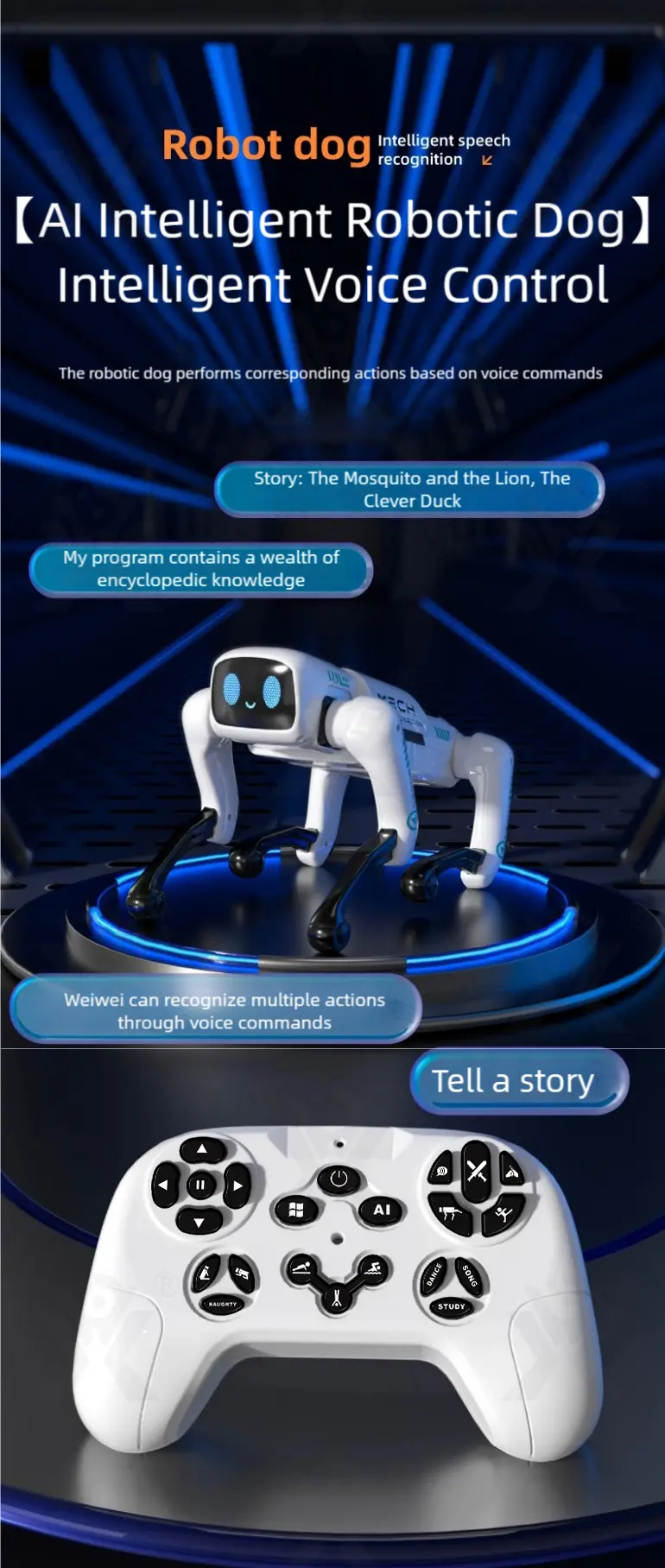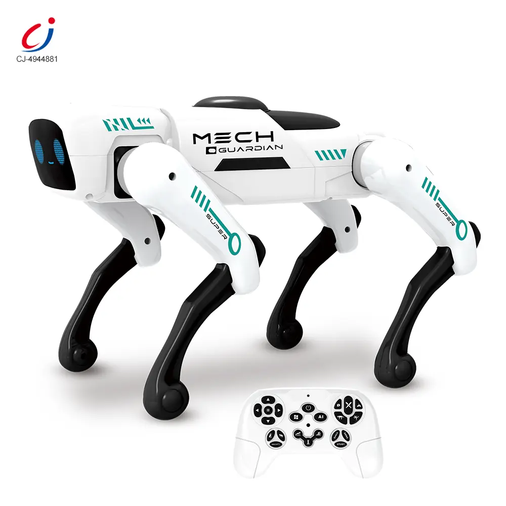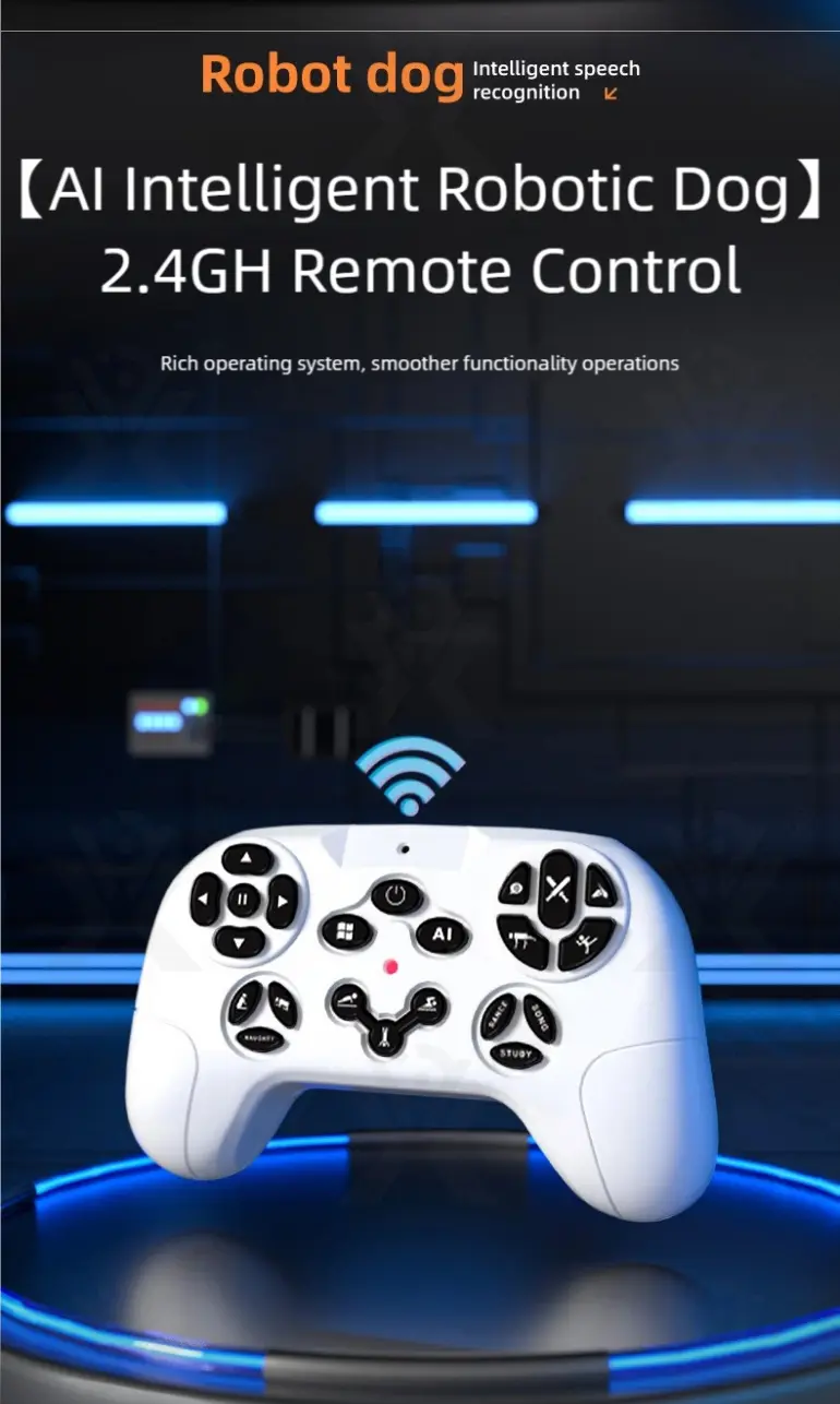 Wholesale AI robotic pet dog toy. This intelligent robotic dog toy features speech recognition, free programming, cool LED eyes, bionic design, and a wireless smart remote for family fun.
