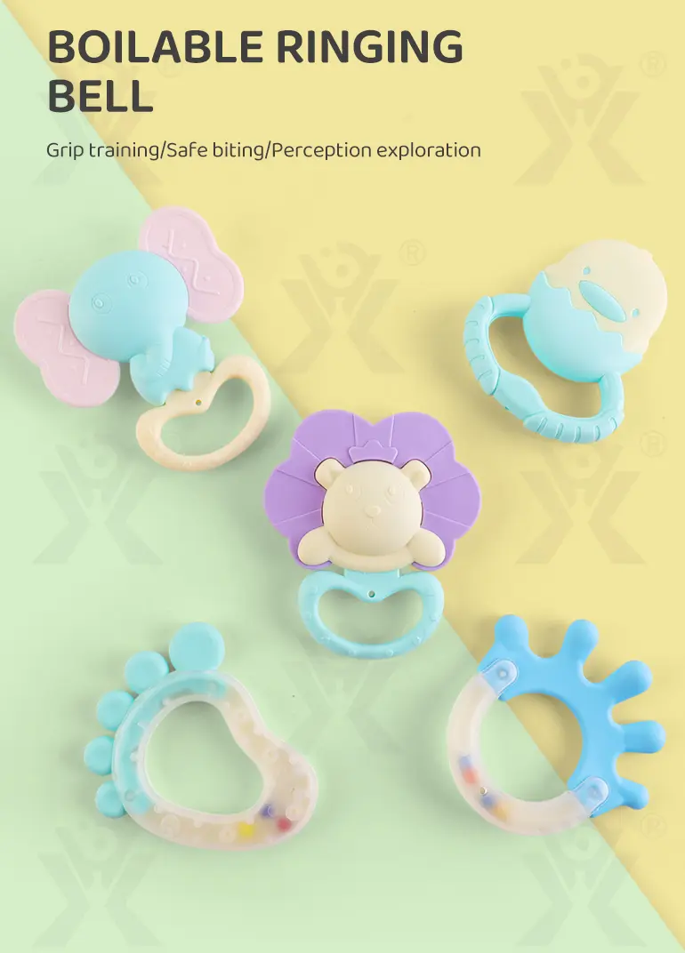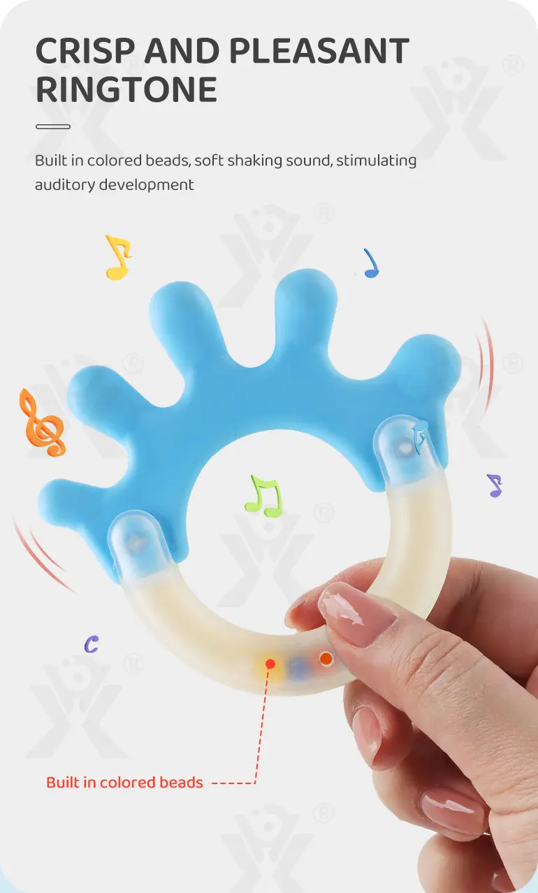 Wholesale baby rattle teething toy. This toy is boilable, with built-in colored beads and crisp sound, safe high-temperature material, trains grip & hearing, ideal for teething & sensory play.