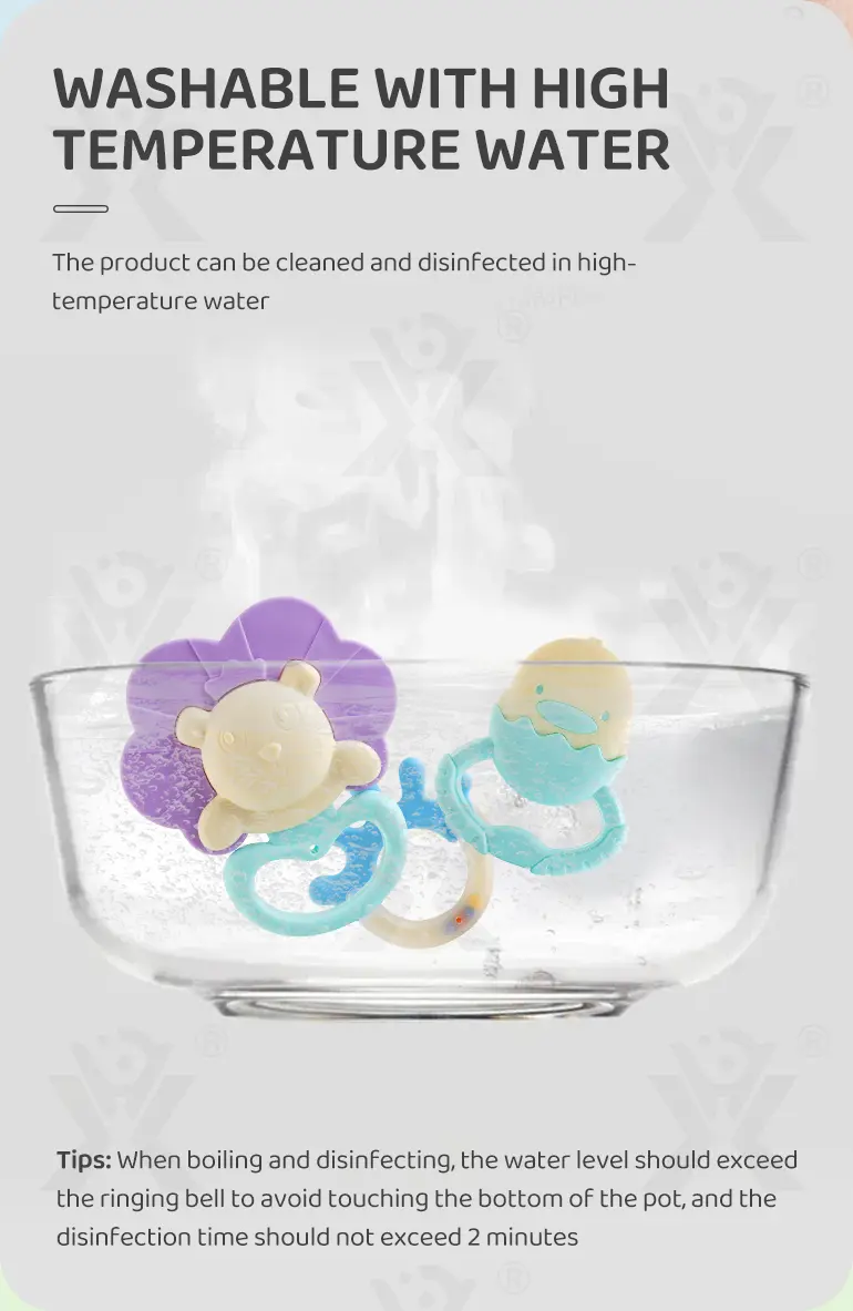 This chew-friendly baby teething toy can be boiled or steamed for hygiene, making it a safe, soothing companion for teething babies. -