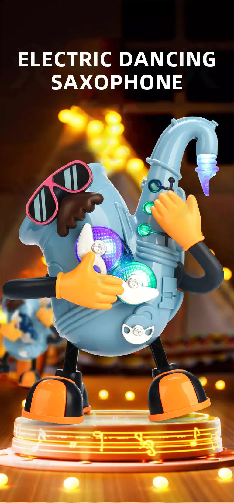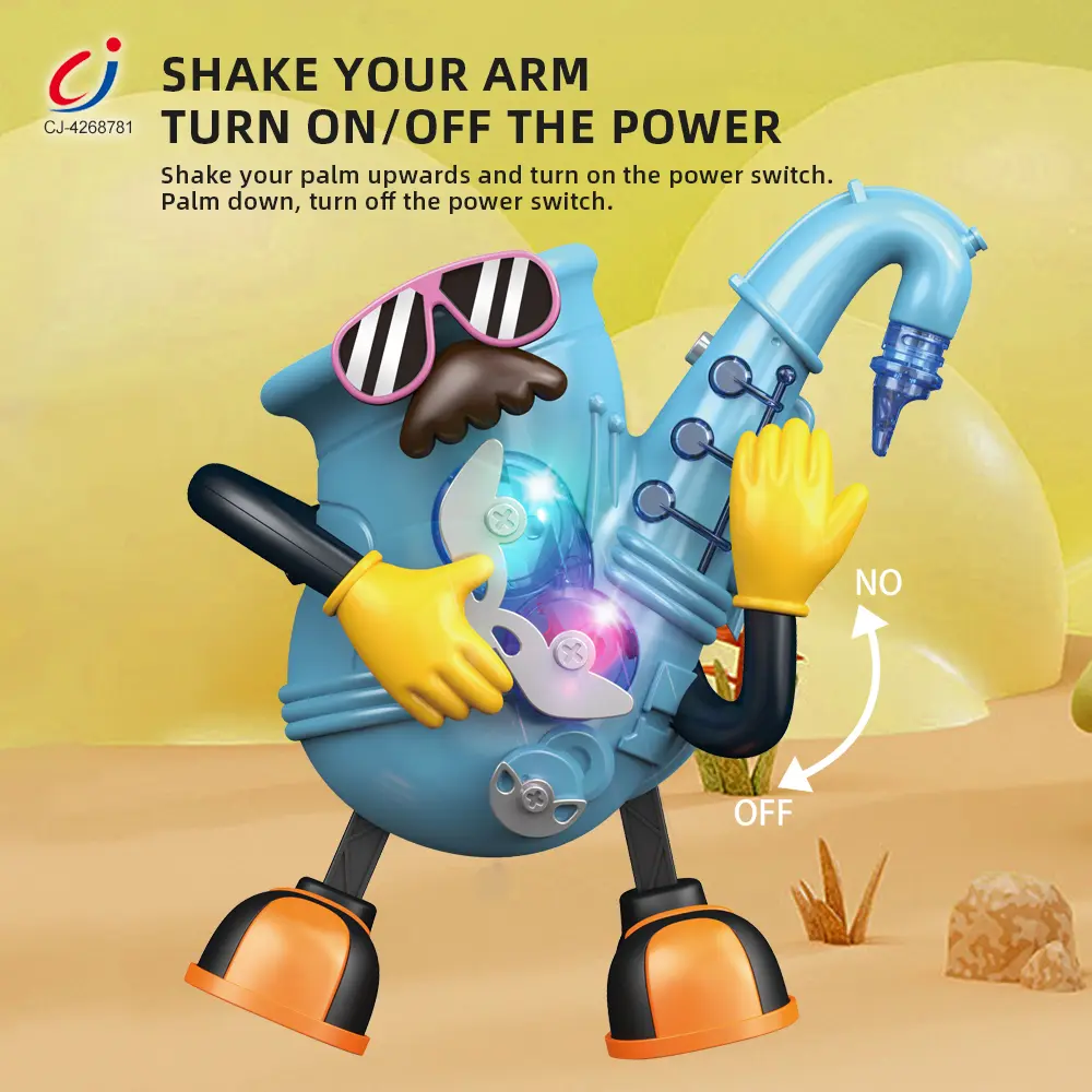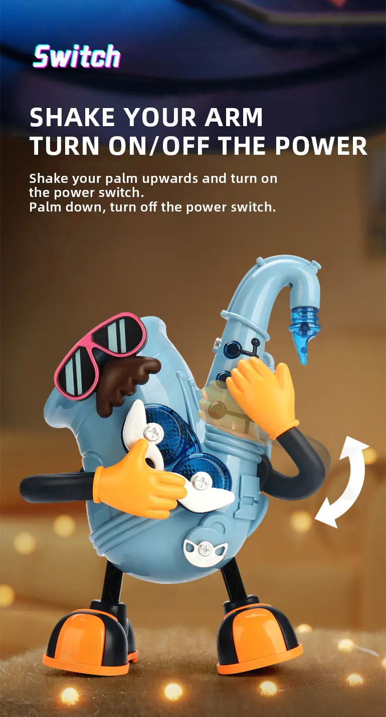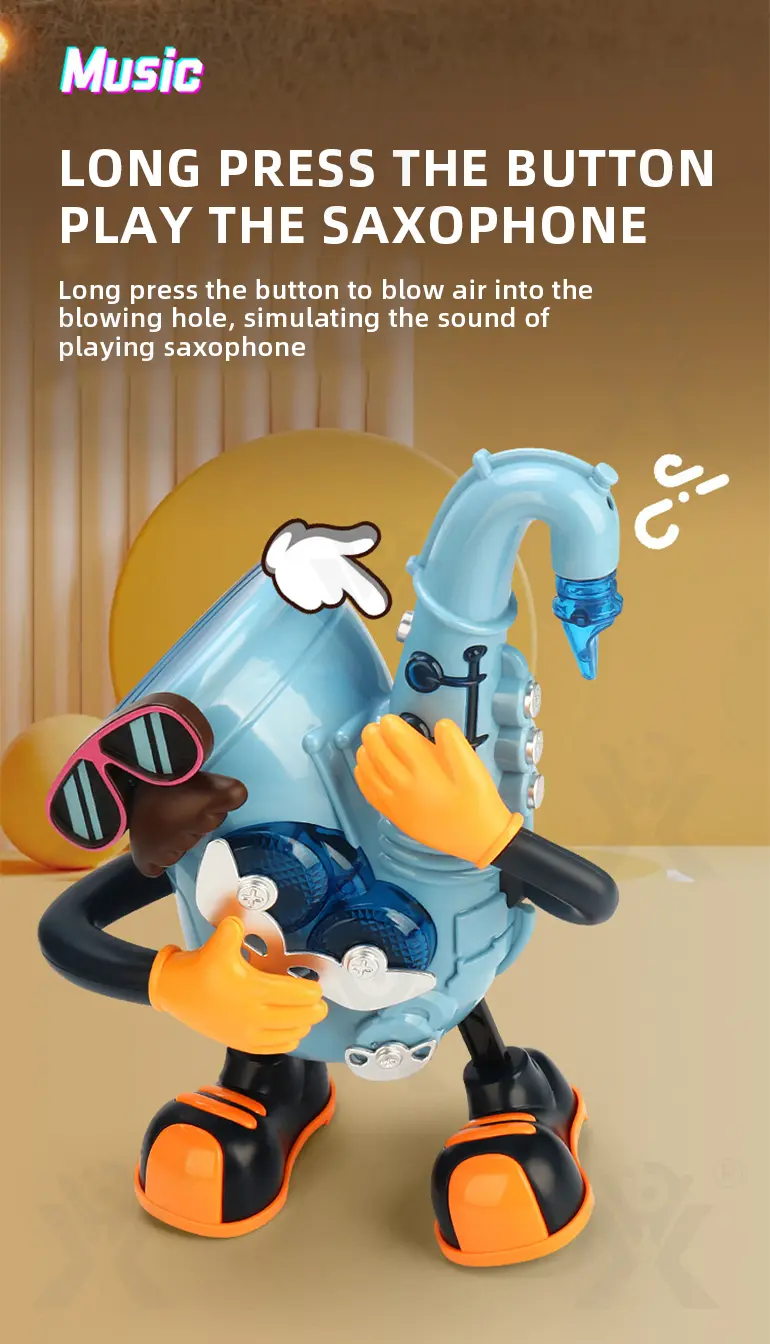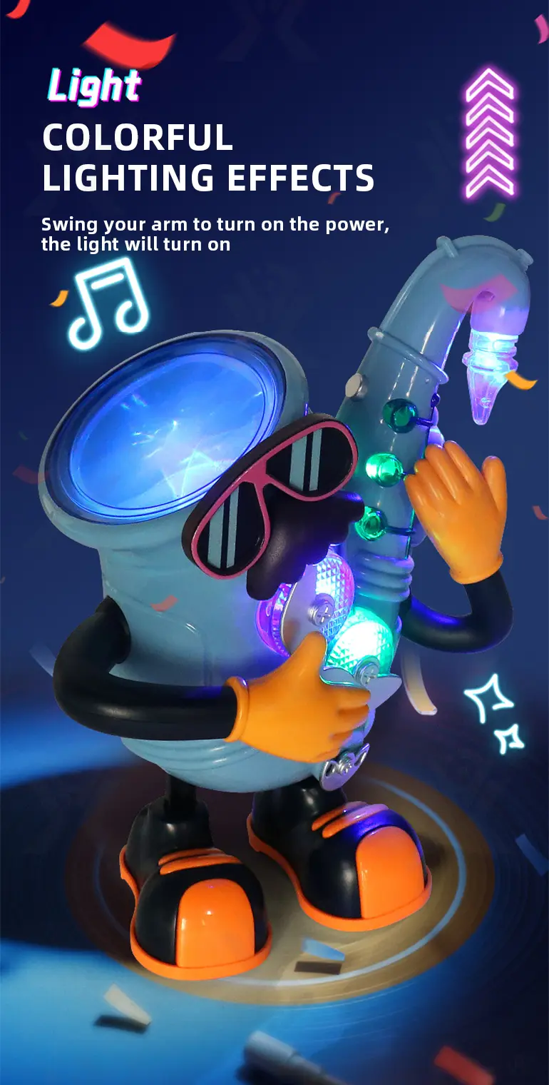 Electric dancing saxophone, arm-swing activation, body sways to music, colorful lights, multi-song switching, develops rhythm & body coordination.