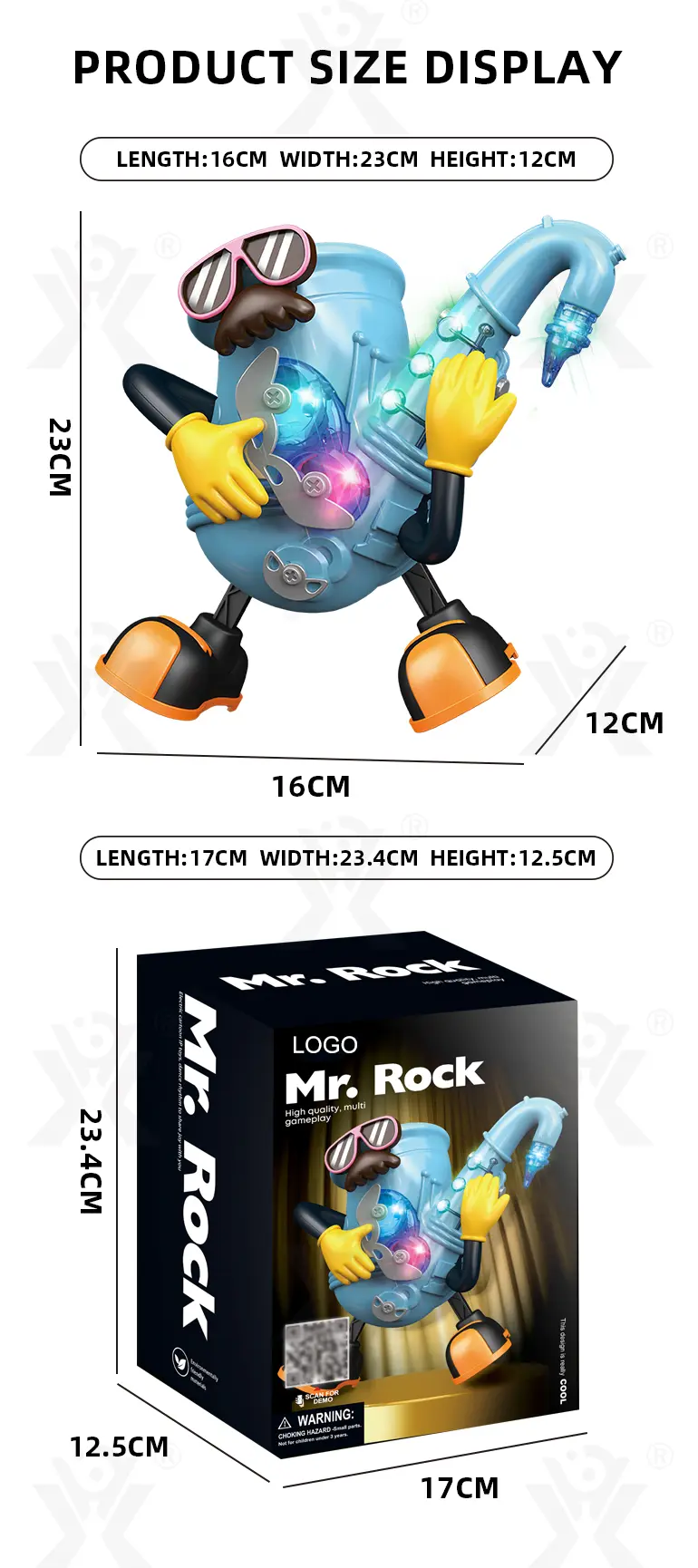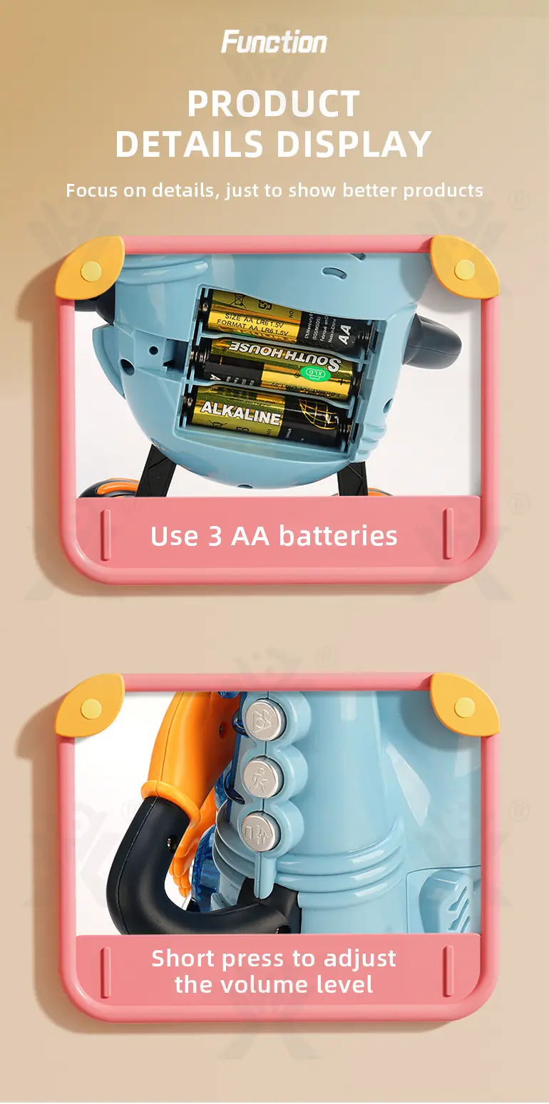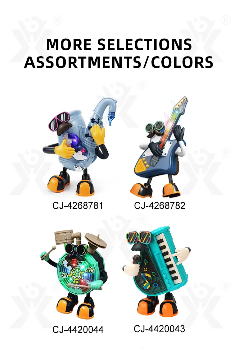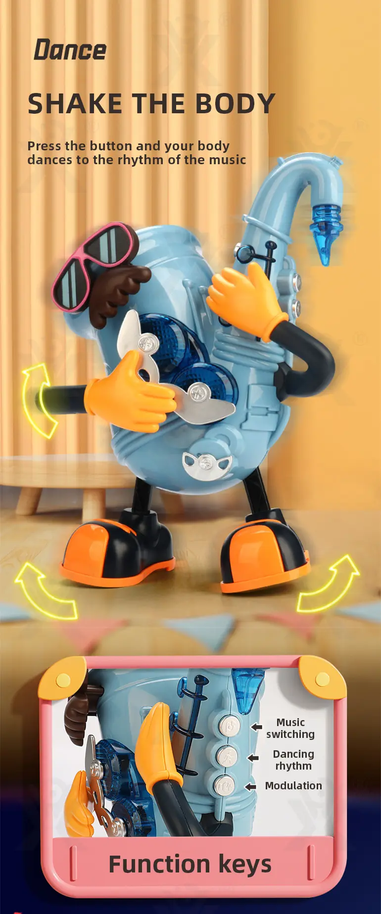Electric dancing saxophone, arm-swing activation, body sways to music, colorful lights, multi-song switching, develops rhythm & body coordination.
