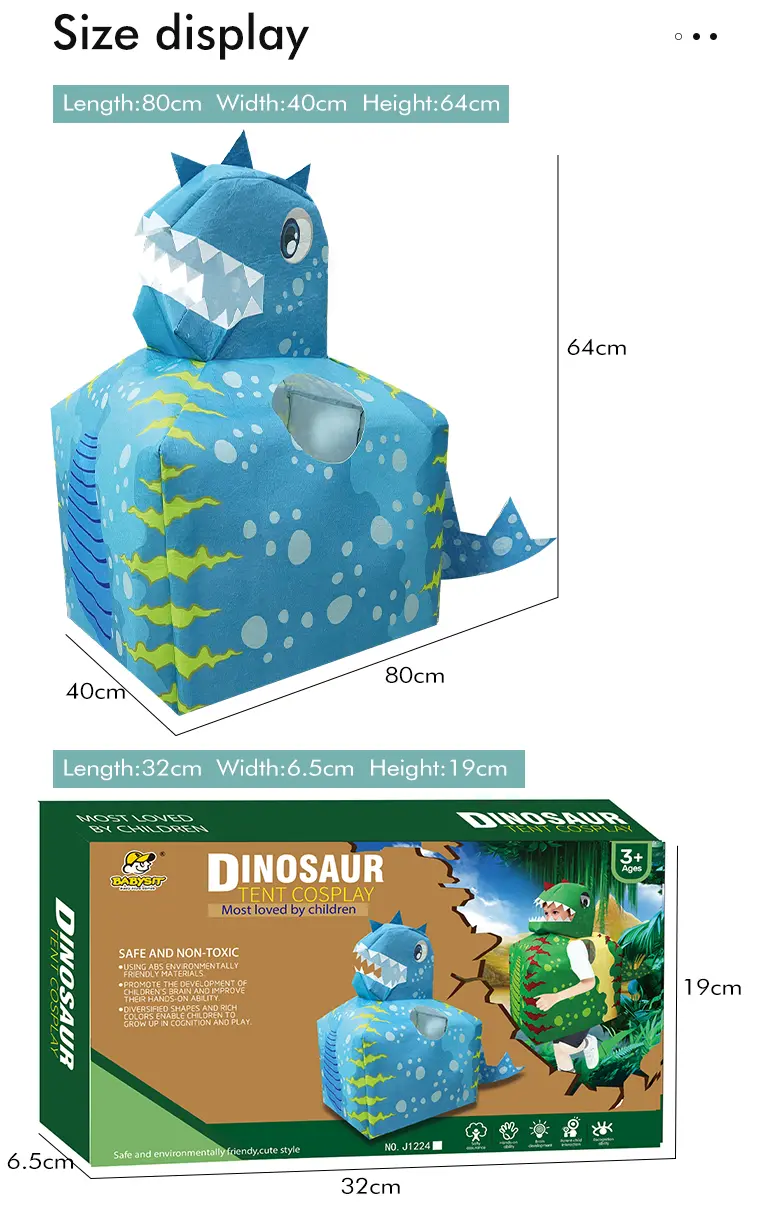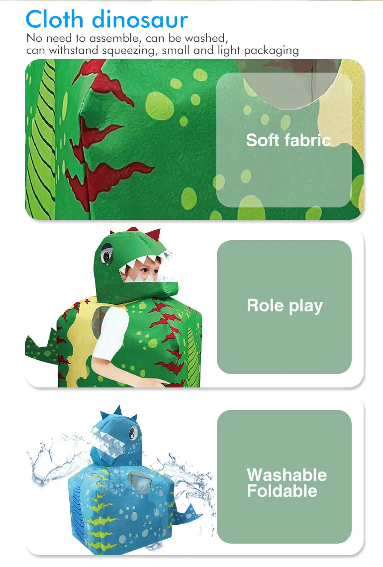 Wholesale dinosaur cosplay cloth. Soft fabric dinosaur cosplay tent, no assembly required, washable, foldable, safe and non-toxic, encourages imaginative role play.