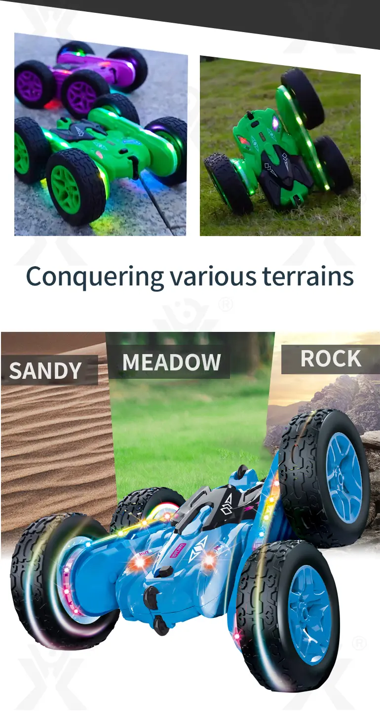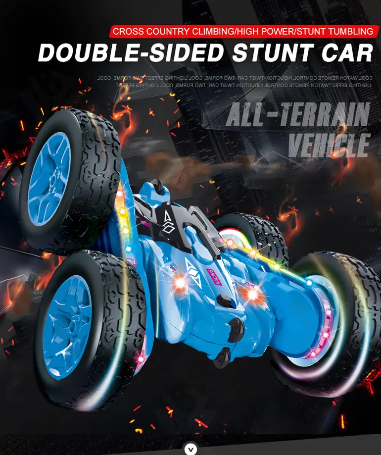 Wholesale 4WD double-sided stunt car, 360° rotation, 7-color lights, 2.4G remote, off-road tires, anti-impact design, Li-ion battery with 30min runtime, all-terrain.