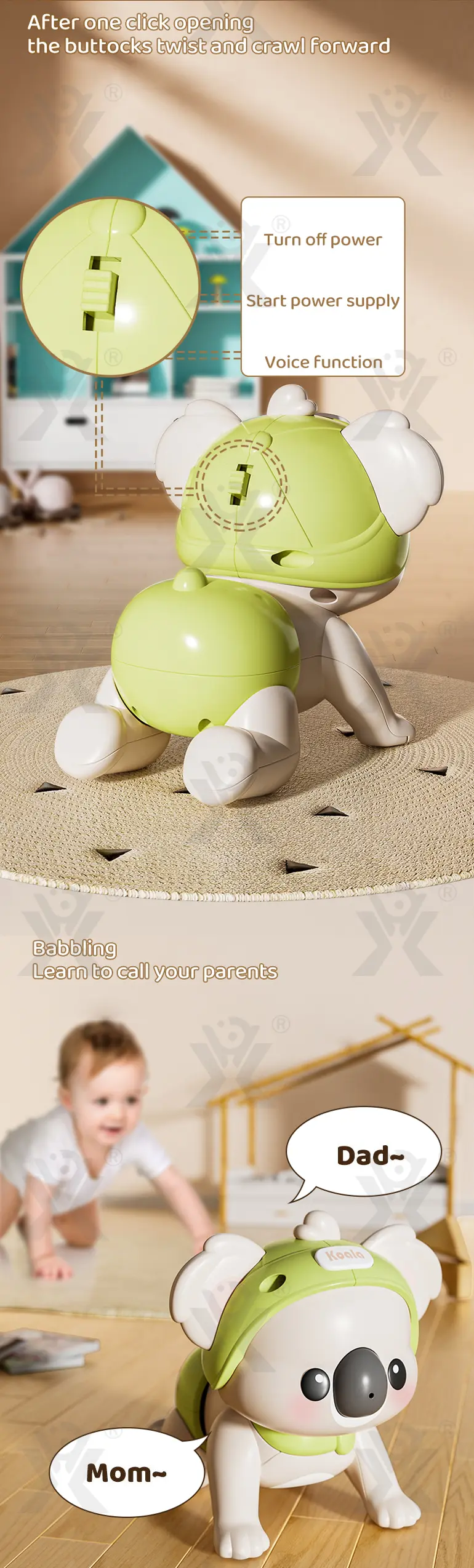 Wholesale electric koala crawling toy, wiggles butt to crawl forward, babbles “mama/dada”, low-noise & ear-protective, soft rubber material, encourages baby to crawl, joyful growth companion.
