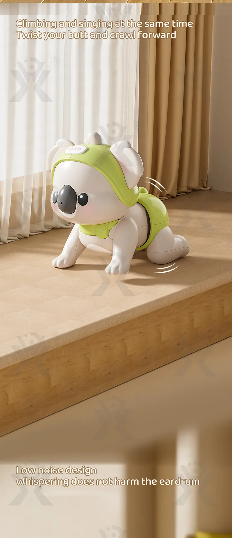 This adorable koala wiggles and crawls forward, motivating little ones to follow—a playful way to build coordination and confidence. -