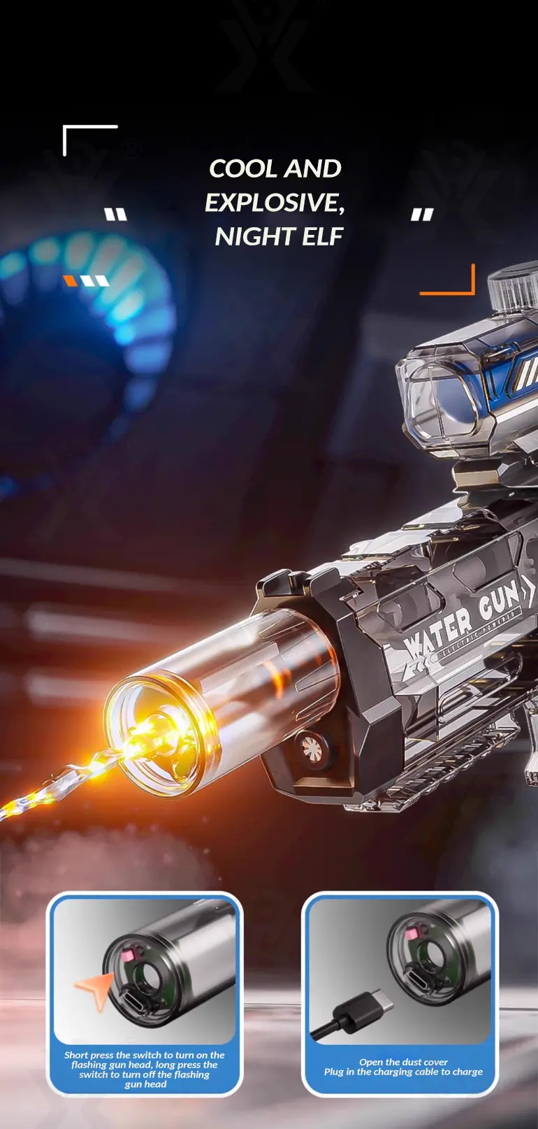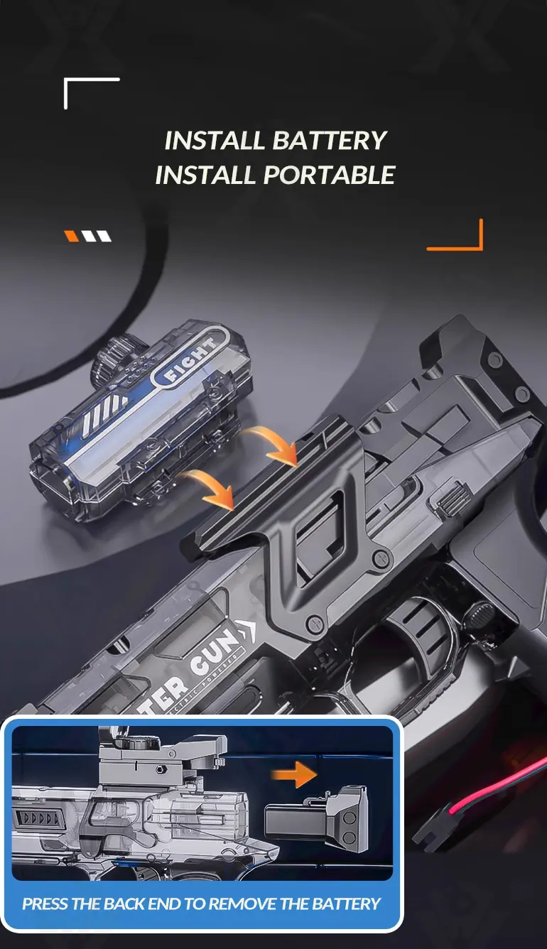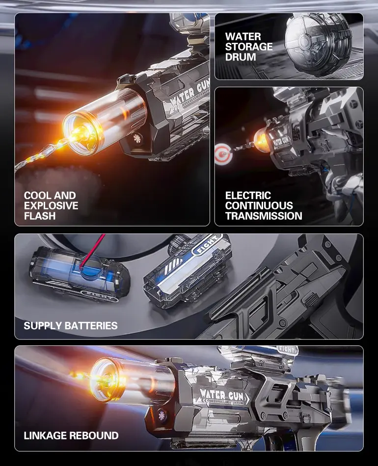 This electric water gun features a flashing gun head (short press on/off) for exciting visual effects during day or nighttime battles.