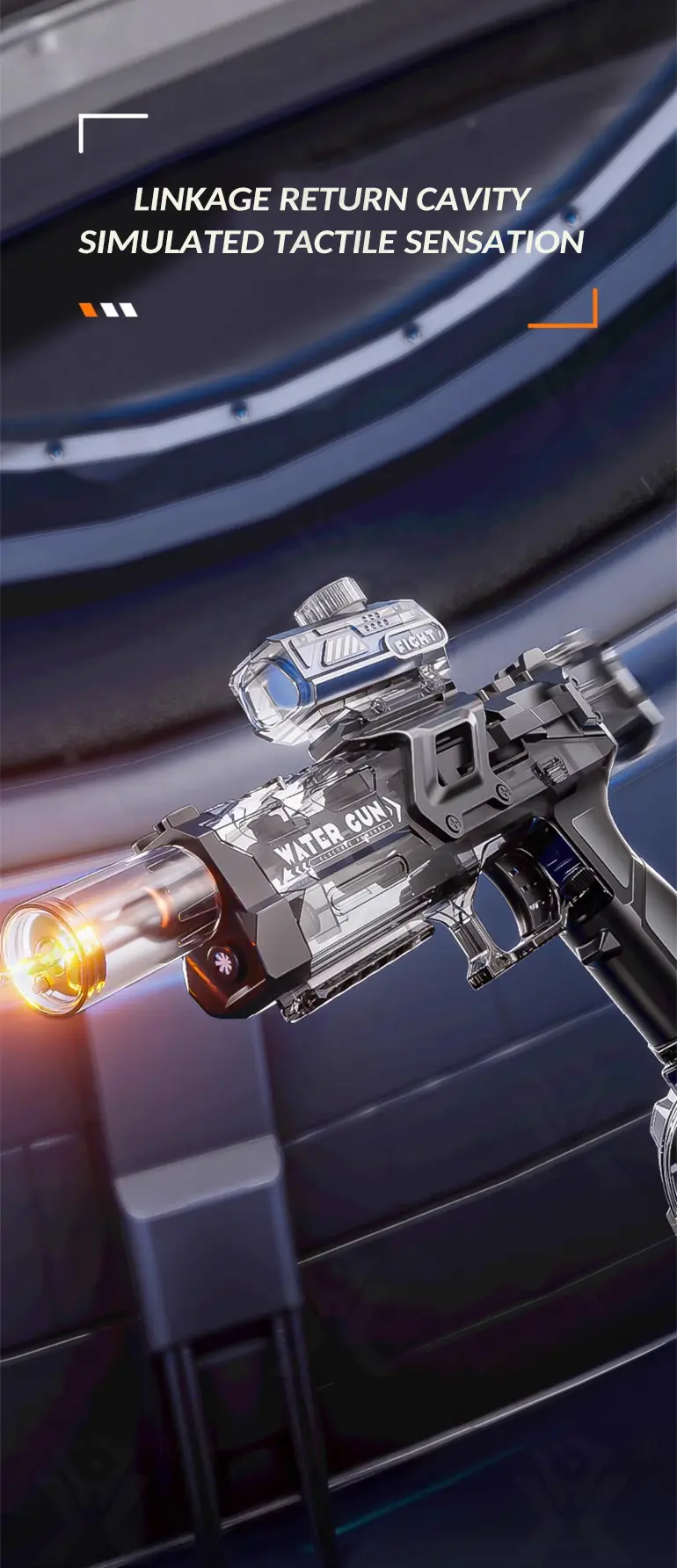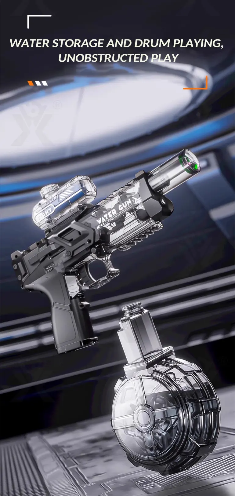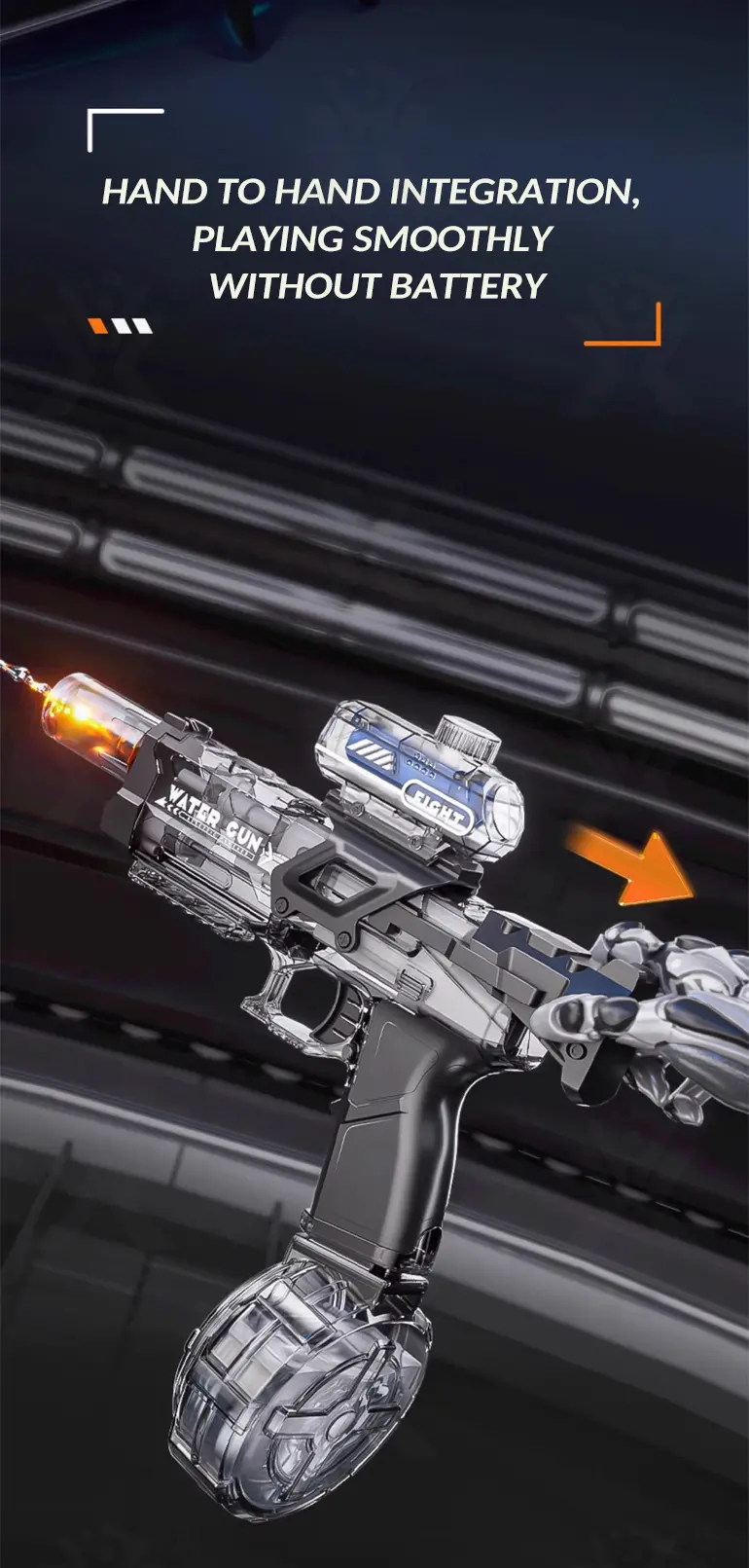 This electric water gun features a flashing gun head (short press on/off) for exciting visual effects during day or nighttime battles.